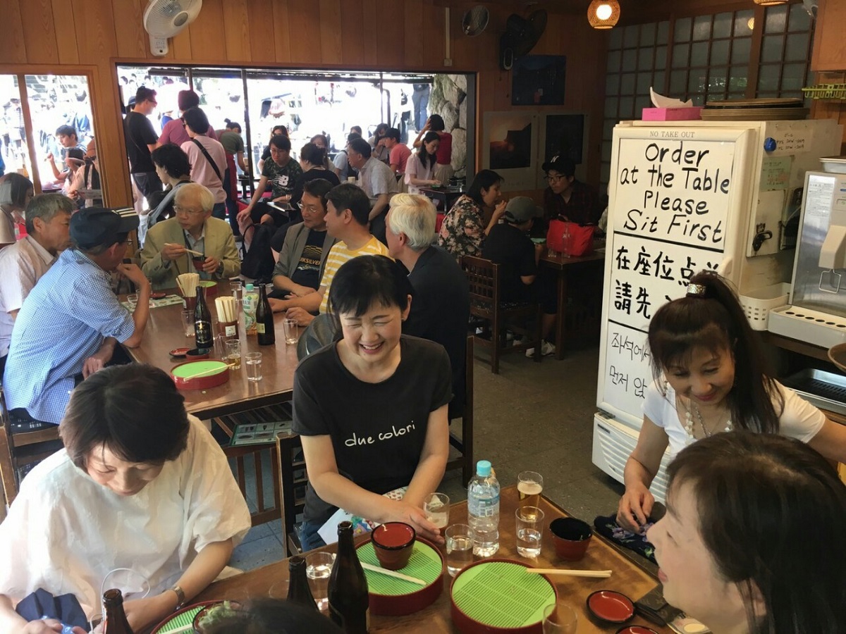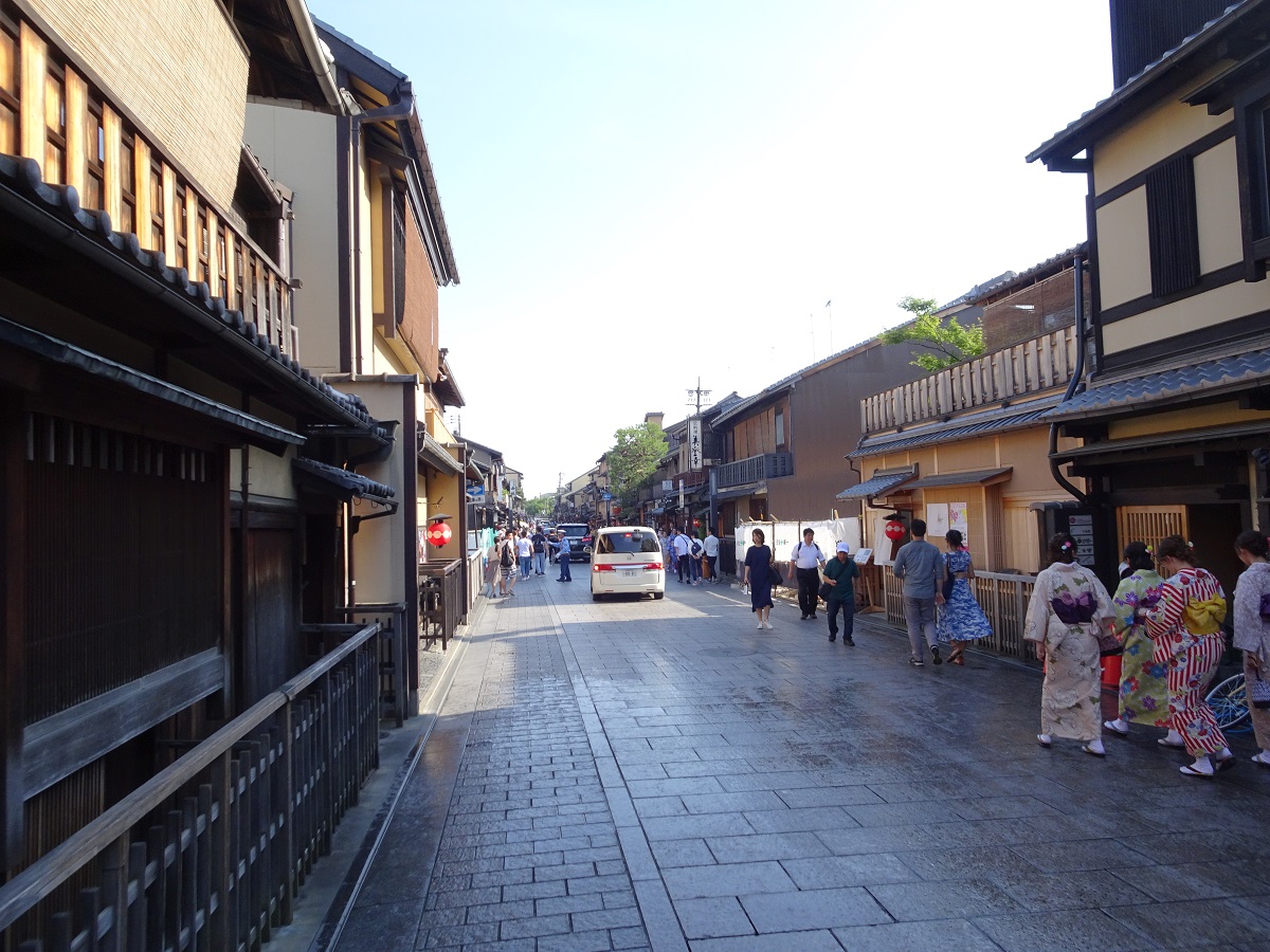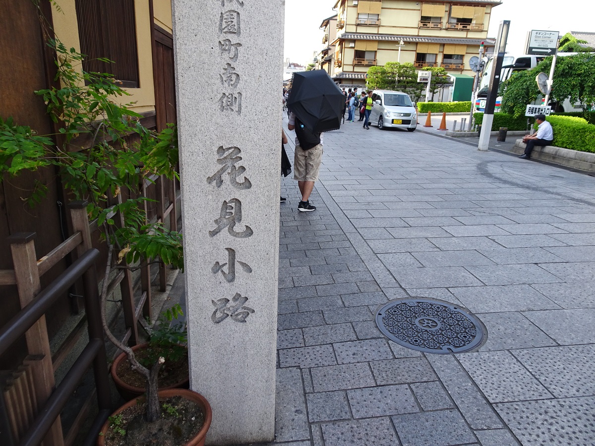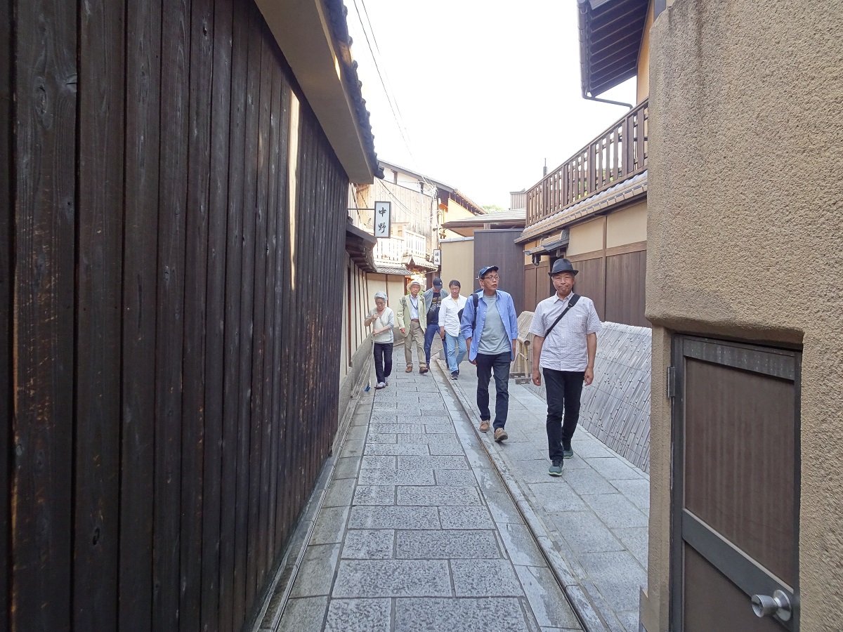 ねねの道は静かだった。高台寺の大きな木々の木洩れ日が石畳に映えて、とてもきれいな道だ。すぐ横の石塀小路の風情も楽しみたいところだが、みんなの疲れた足や目は、早めのゴールを訴えていた(笑)。円山公園の脇を抜け、八坂神社に入ると、さすがの観光スポット、人で溢れていた。せっかくだからと参拝する仲間を見守り、ゴールの花見小路に到着した。ここで解散して、夜の懇親会まで自由時間だ。花見小路は古い京町家の景観を保存しているような風情で、とても美しいエリアだ。高級そうな飲食店や芸妓さんの置屋も多いが、おしゃれな新しい店やカフェもたくさんある。観光客が少なければいいに決まっているのだが、ここも人でごった返している。