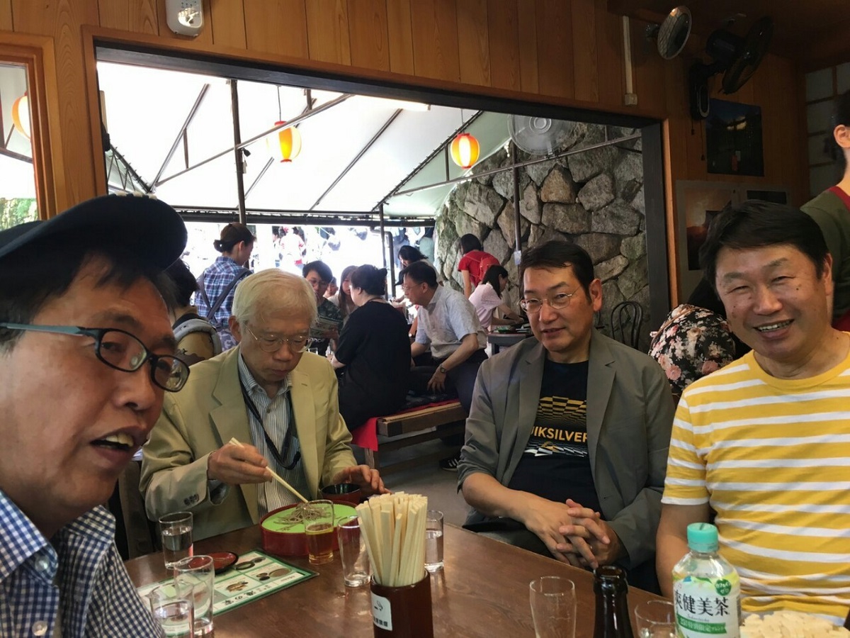 輪の中心にいた幹事のGさんが、後から教えてくれた。みんな、おしゃべりに夢中で、笑いながらダラダラと歩いていたのだそうだ(笑)、これは高校時代の修学旅行に似ている。あのときも、どこを拝観したなど何も覚えてはいない。この日の清水の舞台は改修工事中でテントに包まれていた。きっとそんなことも気にならず、おしゃべりしていたことだろう。音羽の滝の近くの茶店に入ったみんなは、そこでいきなり瓶ビールを回し、蕎麦にパクついていたらしい(笑)。