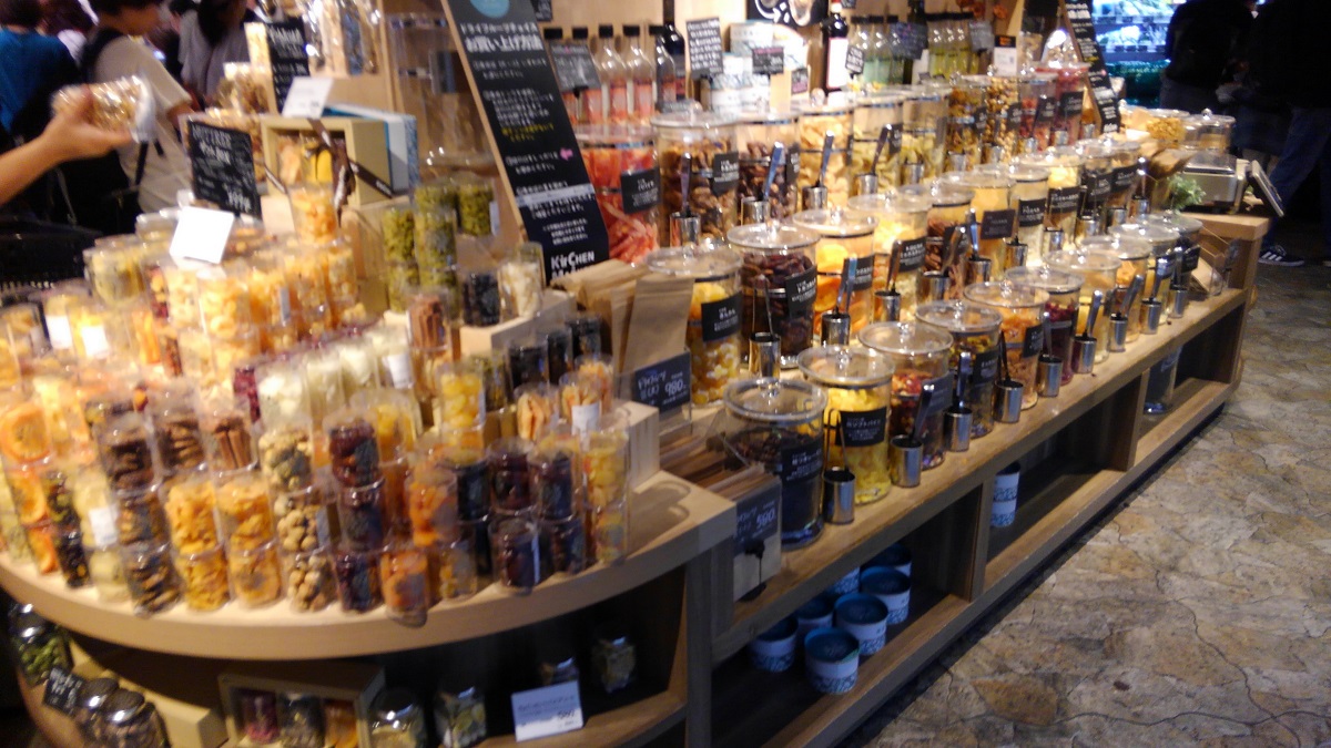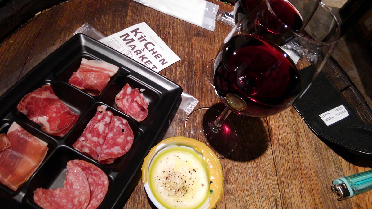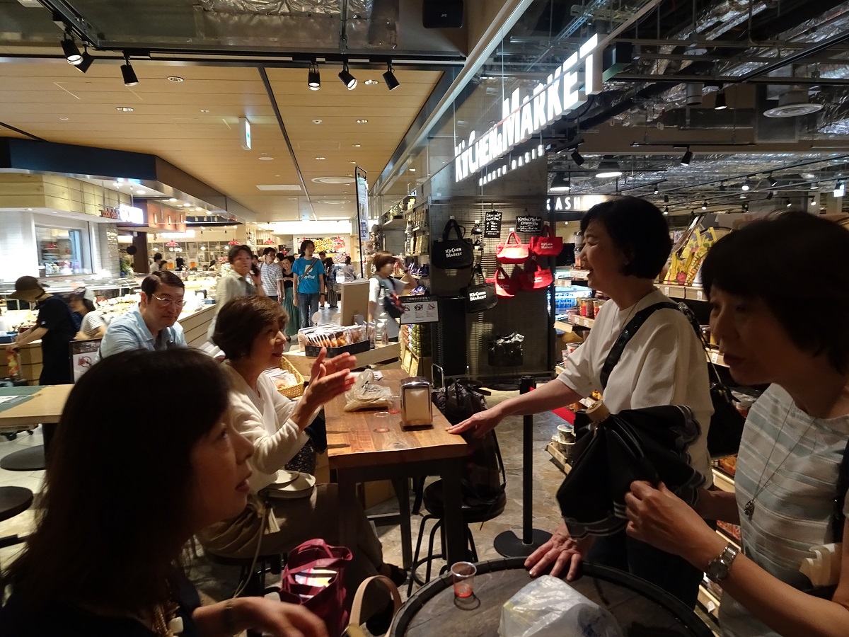 そんな光景を思い描きながら、中央のワイン樽のテーブルを見ていたら、知っている顔の女性が座っていた。昨夜の祇園でみんなを沸かせたトークの達人、T村さんだった(笑)。どうやら彼女たち3人も、集合時間まで、ここで昼酒を楽しむようだ。握り寿司とクラフトビールの飲み比べセットを抱えたT中Y美さん、S本さんが席に戻ってきて、乾杯がはじまった。負けじとK中くんが、ワイン、チーズ、生ハムを買ってきて、僕たちの昼酒も始まった。そうこうしてるうちに、キルフェボンのフルートタルトを思い出し、早々にワイン樽の酒場を離脱して、ふたたび南館へ向かった。結局、キルフェボンは45分待ちの行列で、あのフルーツタルトをあきらめた(悲)。もう少し、ワイン飲んでりゃよかったかな(笑)。