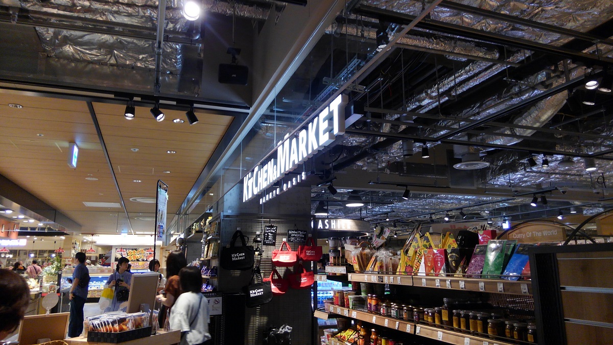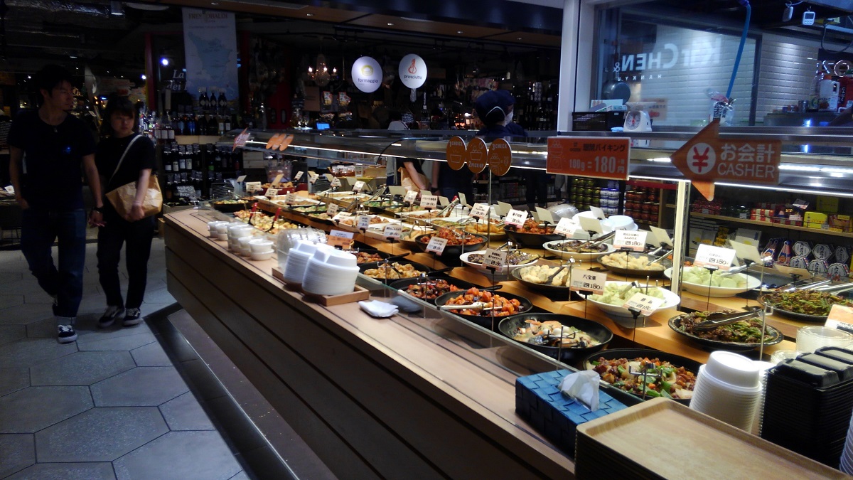 阪急梅田からグランフロント南館に向かう途中に商業施設「ルクア」がある。ここの地下にバルストリートやフードホールがあるので、立ち寄ってみることにした。ここのフードホールがやばい。グルメスーパーを思わせる様々なショップの店頭に作り立てのデリやサラダ、肉料理、寿司、チーズなどの専門店が並んでいるのだが、そこで買った商品を中央のテーブルで食べることができる。さらに近くのバーでグラスワインでも買ってくれば、そこは酒場に変身する。