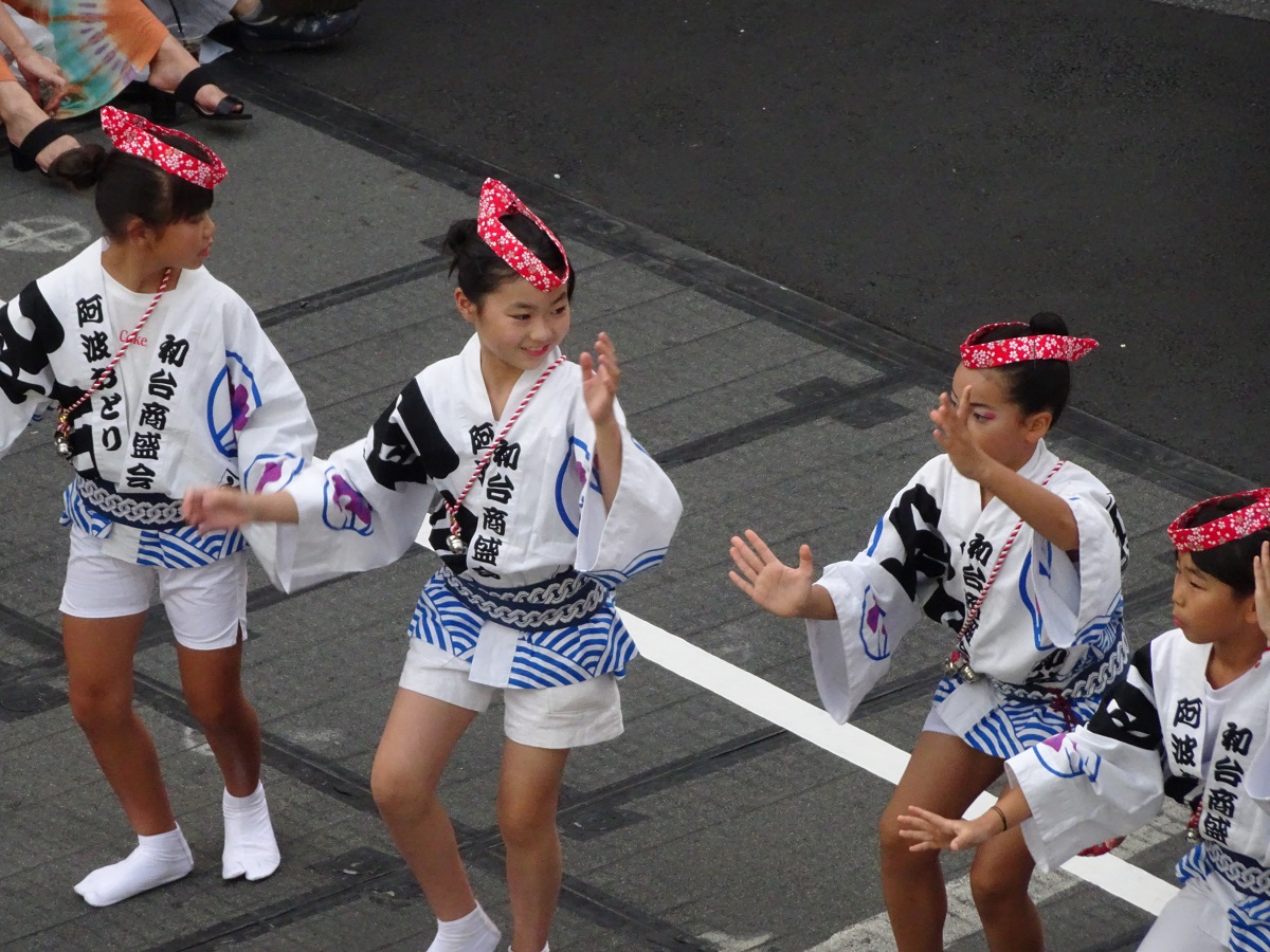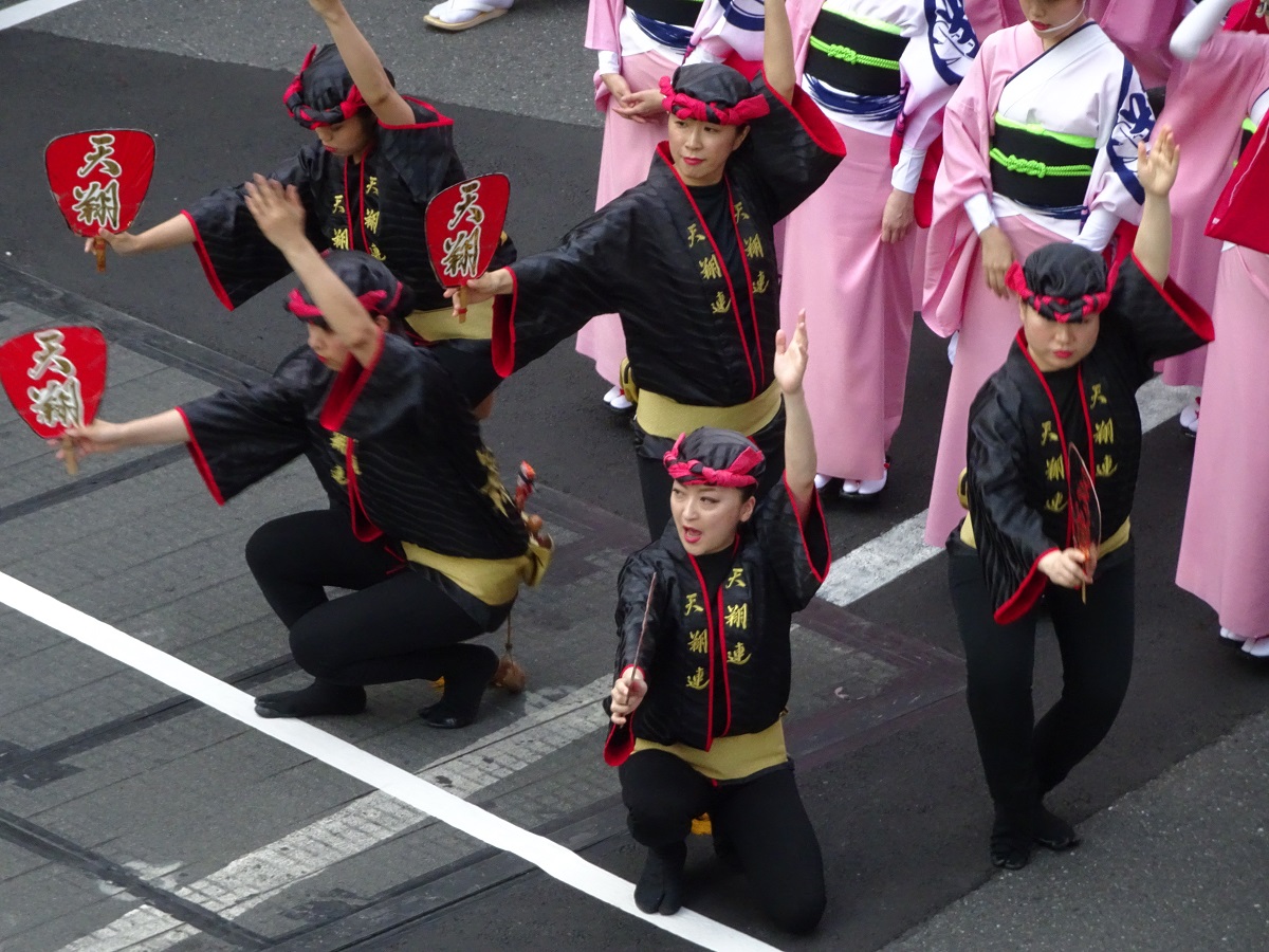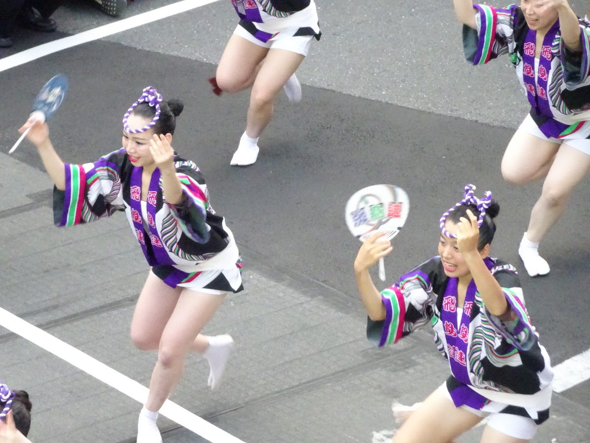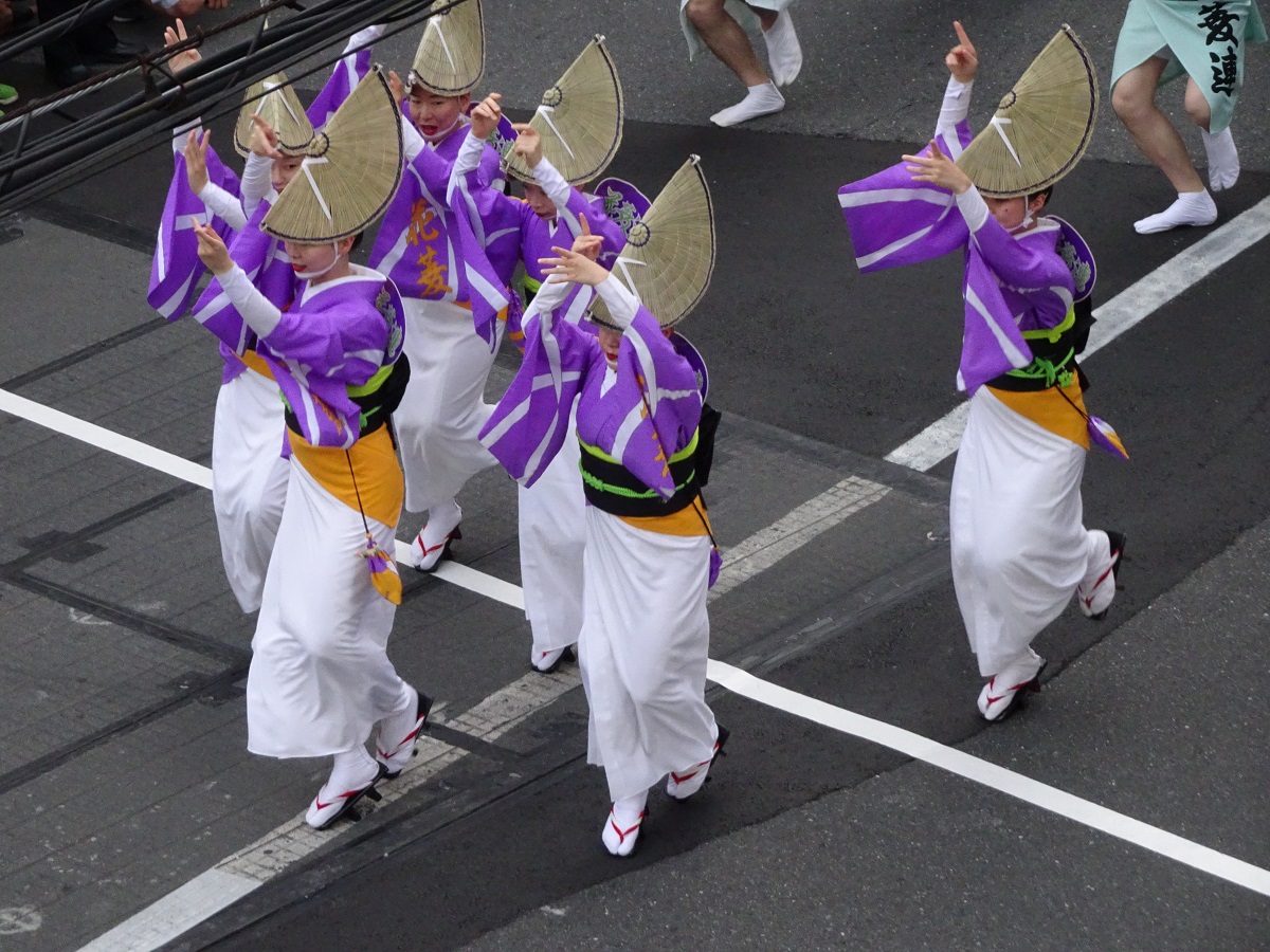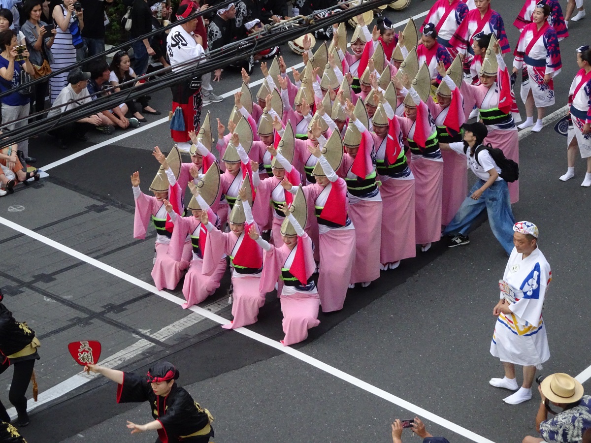 17時ちょうどに、8か所の演舞場から、一斉にスタートしたようだ。終了の20時までの間に、踊り手たちは演舞場から次の演舞場へとどんどん会場を変えて踊りを披露する。観客たちの目の前を次々に連の踊り手たちが進んでいく。どの連にも個性があって、ものすごい熱気だ。