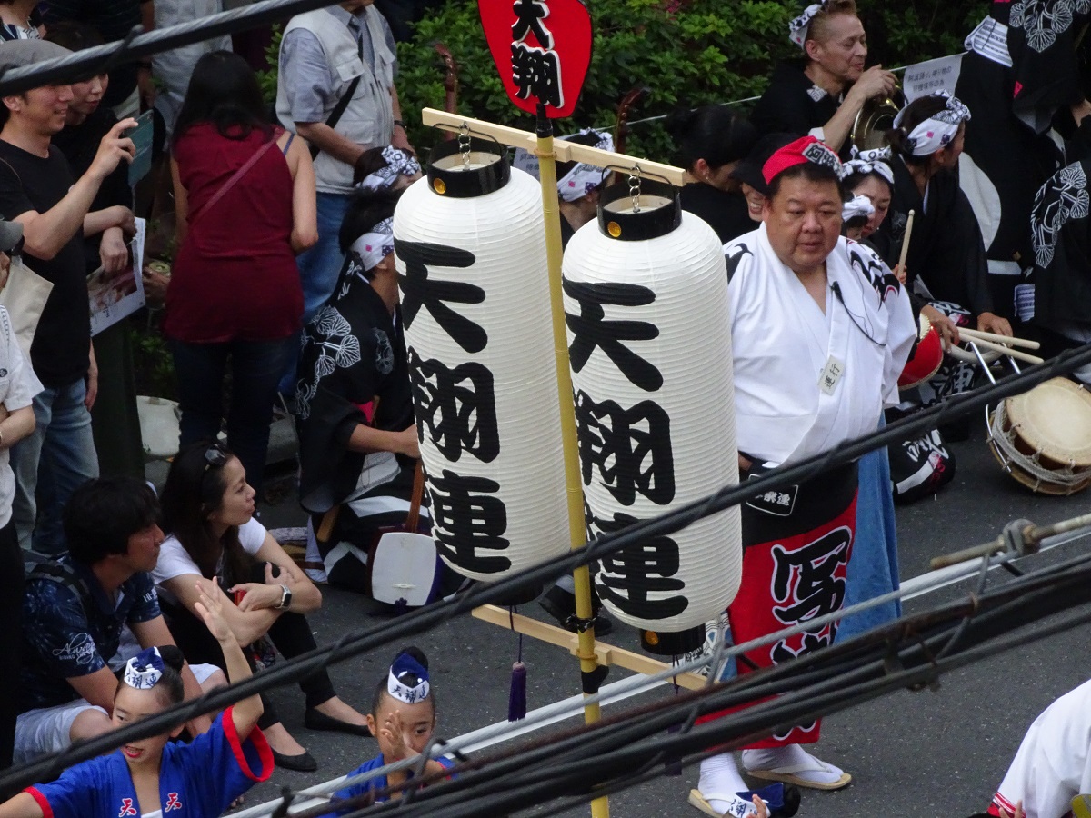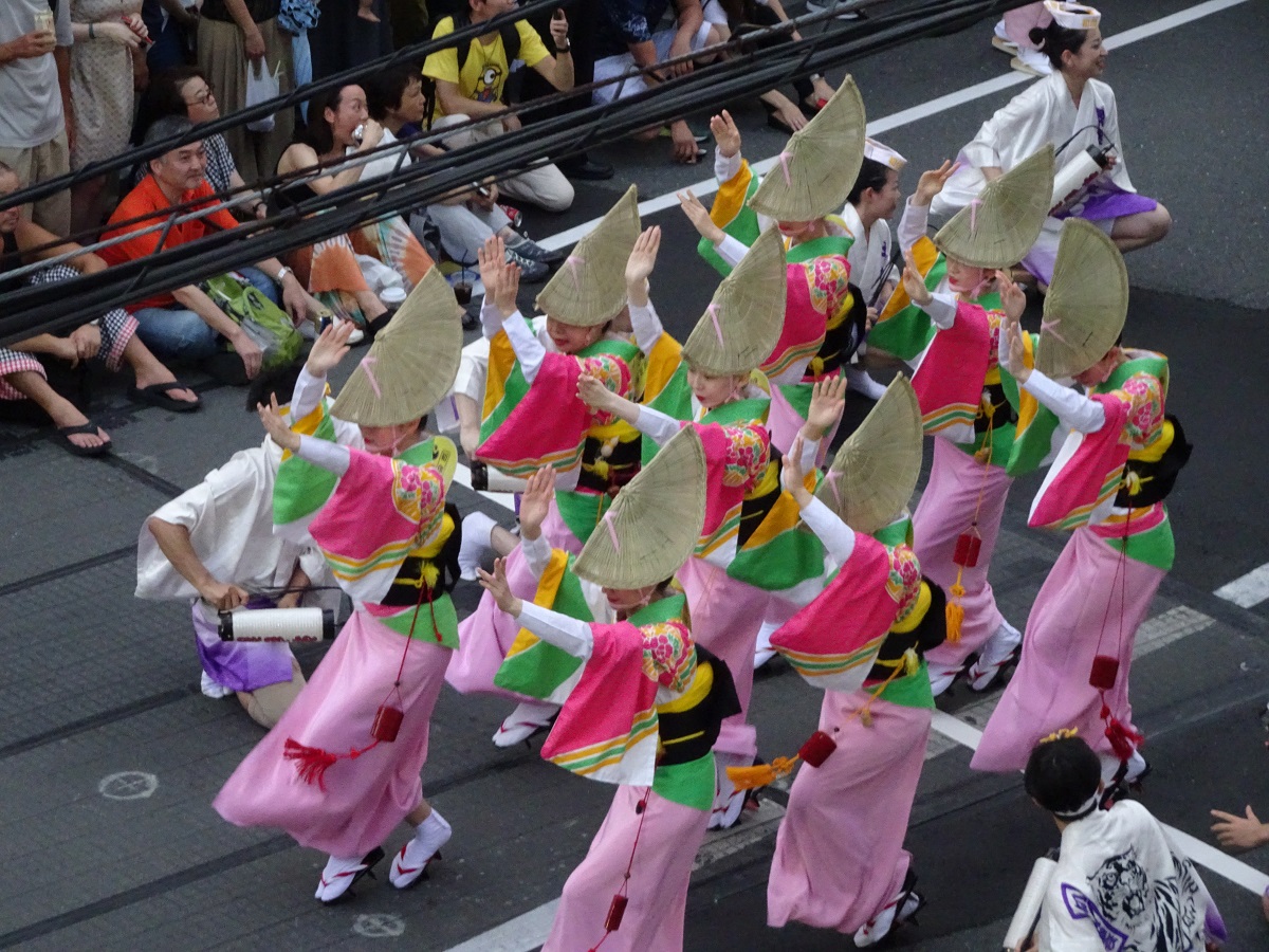 鳴り物は三味線、横笛などから、鉦(かね)や小太鼓、大太鼓など、連によって様々だが、鉦や太鼓の単純なリズムが、速くなったり強くなったりと、踊りの激しさをコントロールしているようだった。あの単純な2拍子は、なぜか日本人の魂を揺さぶるリズムなのだろう。観客にはお気に入りやご贔屓の「連」があるようで、スタート前の拍手の大小で人気が分かったりする。人気の連には追っかけまでいるらしい(笑)。