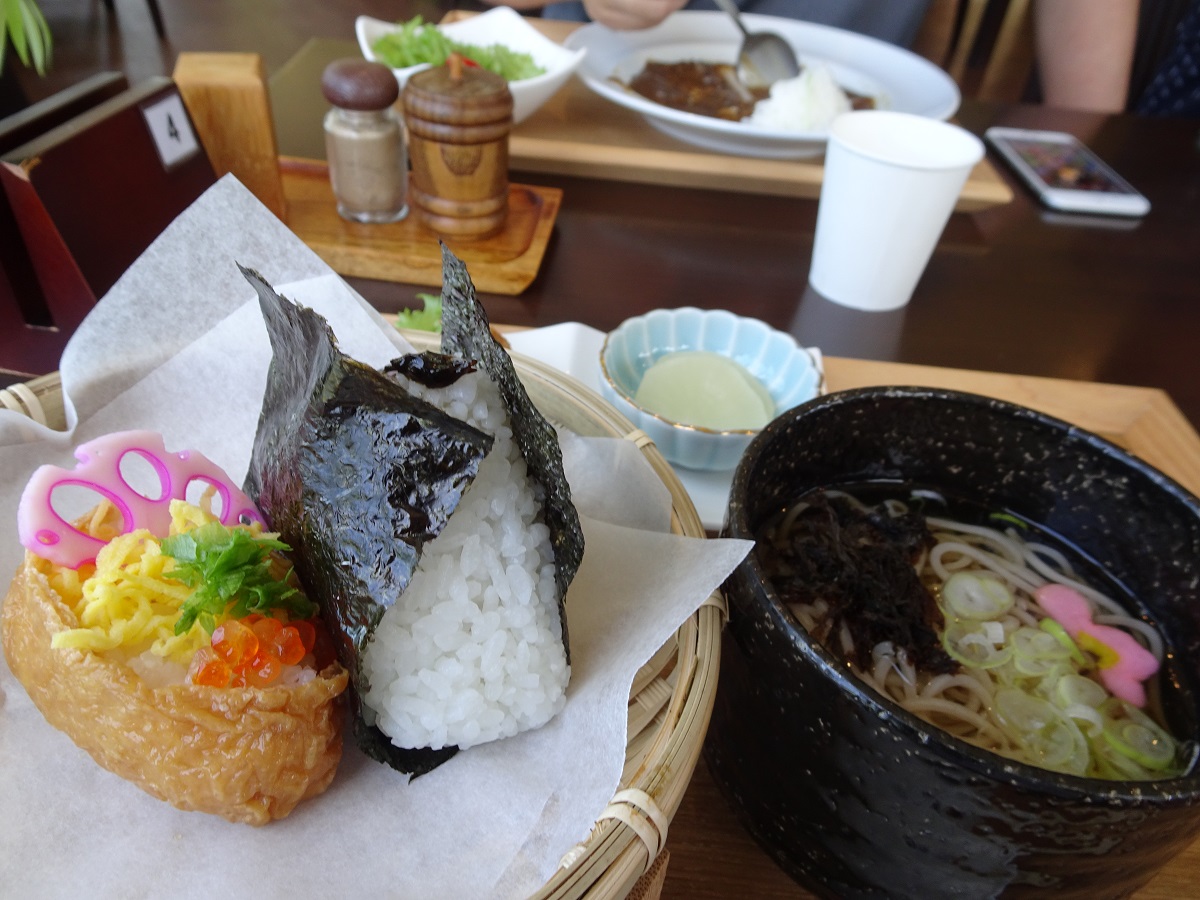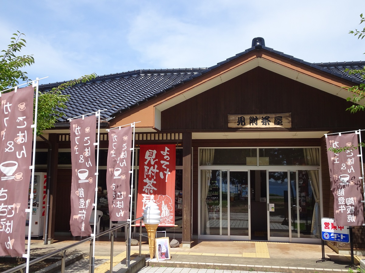 晴天で波もなく、静かに浮かぶ見附島の雄姿にしばらく見入って、さっそくのランチタイムです。見附島カレー?は見附島を再現した盛り付けだとか、おにぎりセットは「えんむすび」という名前で、このビーチが「えんむすびーち」という名前なんだとか、小さなネタを満載したメニューに感心していました。
