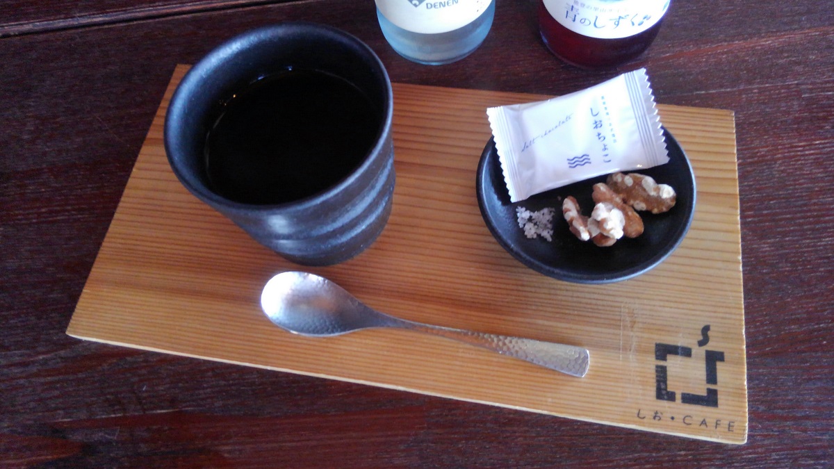 次の目的地は、その途中にある「しおカフェ」という小さなカフェです。揚げ浜式の塩田が、この途中に何か所かあり、その「塩」と「地域」そのものをコンセプトにしたカフェのようです。うっかりして通り過ぎてしまい、Uターンして戻ることになるほど、目立たない建物でした。それもそのはずで、ここにあった古い民家を再生した建物で、あえて周囲になじむようにと、看板などは控えめにしているのだそうです。そう笑顔で説明してくれたのは、スーツ姿の高齢美女で、どうやらここのオーナーだろうと思います。