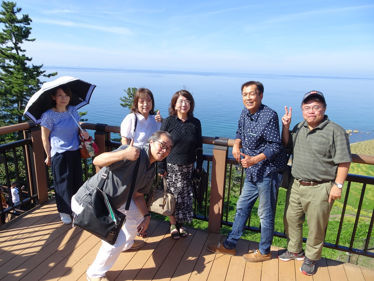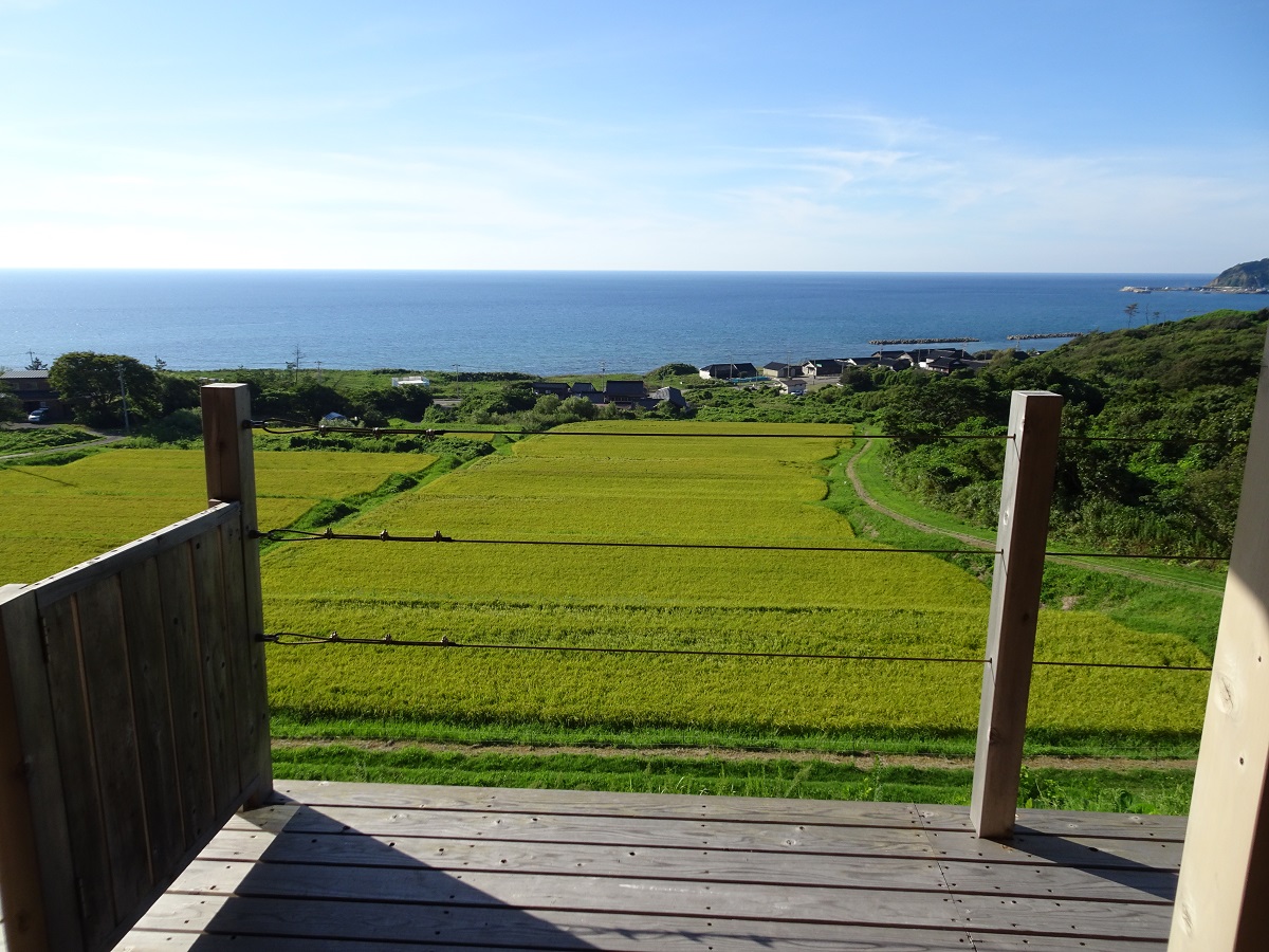 次の目的地は白米千枚田(はくまい、ではなく、しろよねです)のポケットパーク。有名な海岸線の千枚田の景色を、上から見下ろす絶景ポイントにあります。遠い台風と関係あるのかどうかわからないのですが、空気がとても澄んでいて、水平線の向こう側に、小さな島々が見えました。Y子ちゃん曰く、七ツ島だそうです。輪島の沖合20kmの彼方にある小さな島が、すぐそこにあるようです。