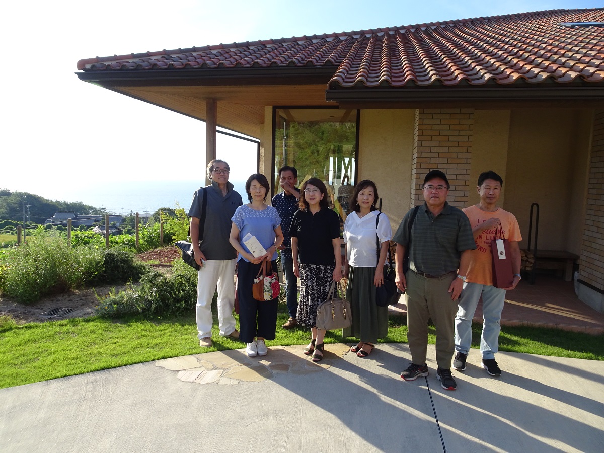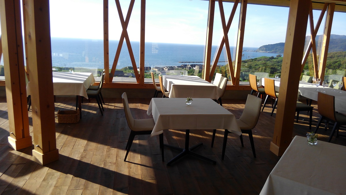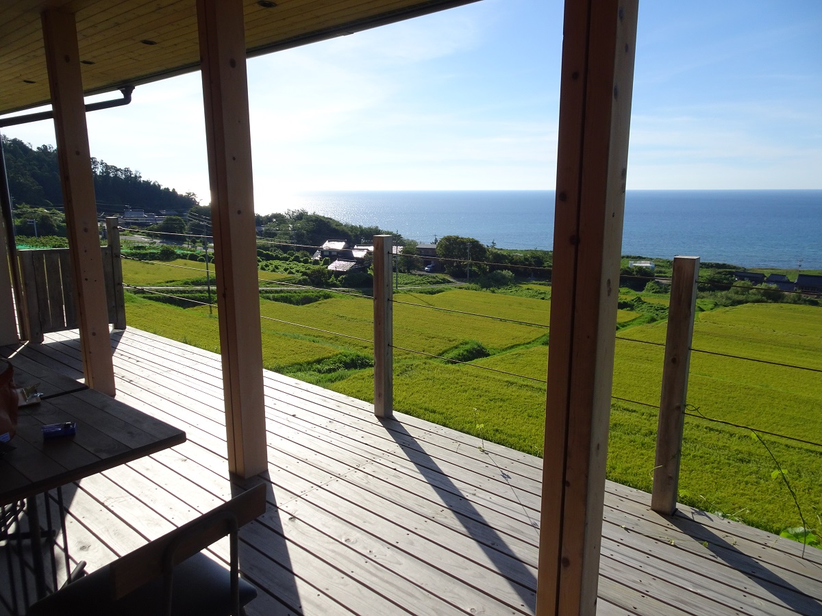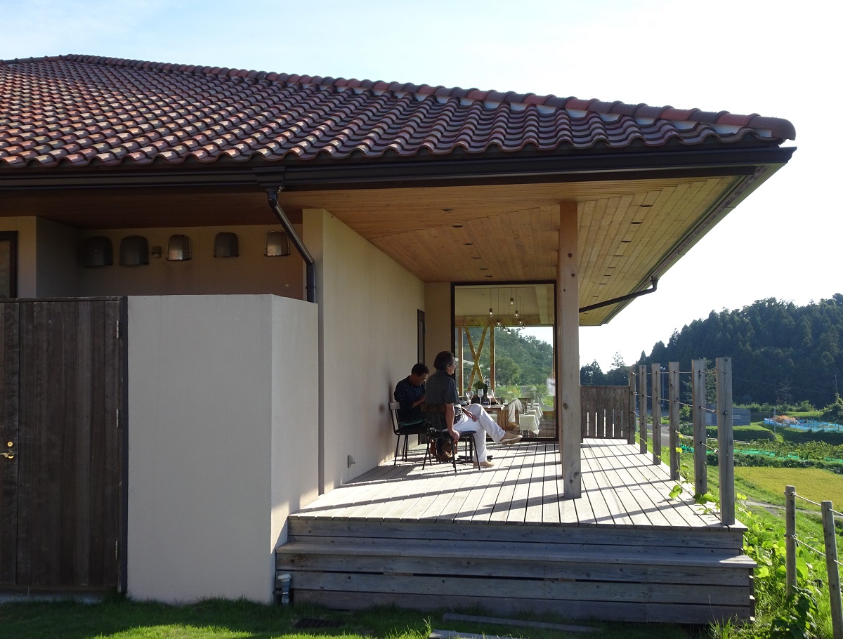 この敷地内に独立したカフェレストランが建っていて、それが今回の目的地です。丘の上からの景色がとにかく素晴らしくて、夕暮れに向けて傾いた陽射しが遠くの海に影を落とす、そんな絶妙の時間に到着しました。この景色をみんなに見せたかったんです。建物の海側には木製のウッドデッキがあって、外でのカフェが楽しめるテラス席がひとつだけあります。そこに座り、やさしい海風を受けて、ぼ~っとした時間を過ごすのが最高の贅沢のように感じます。