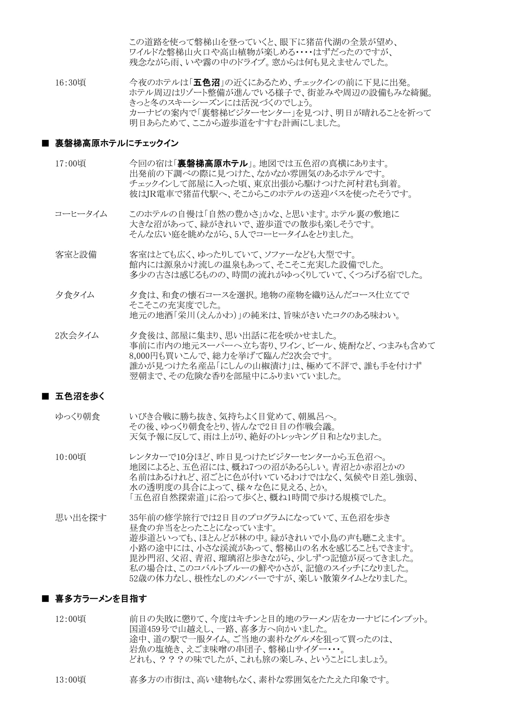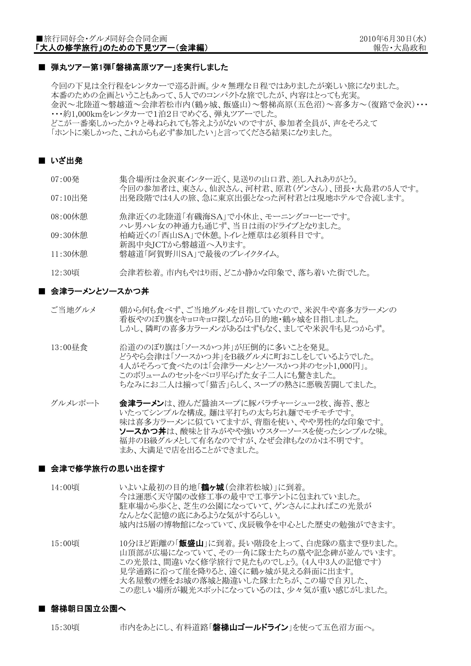 金沢~北陸道~磐越道~会津若松市内(鶴ヶ城、飯盛山)~磐梯高原(五色沼)~喜多方~(復路で金沢)