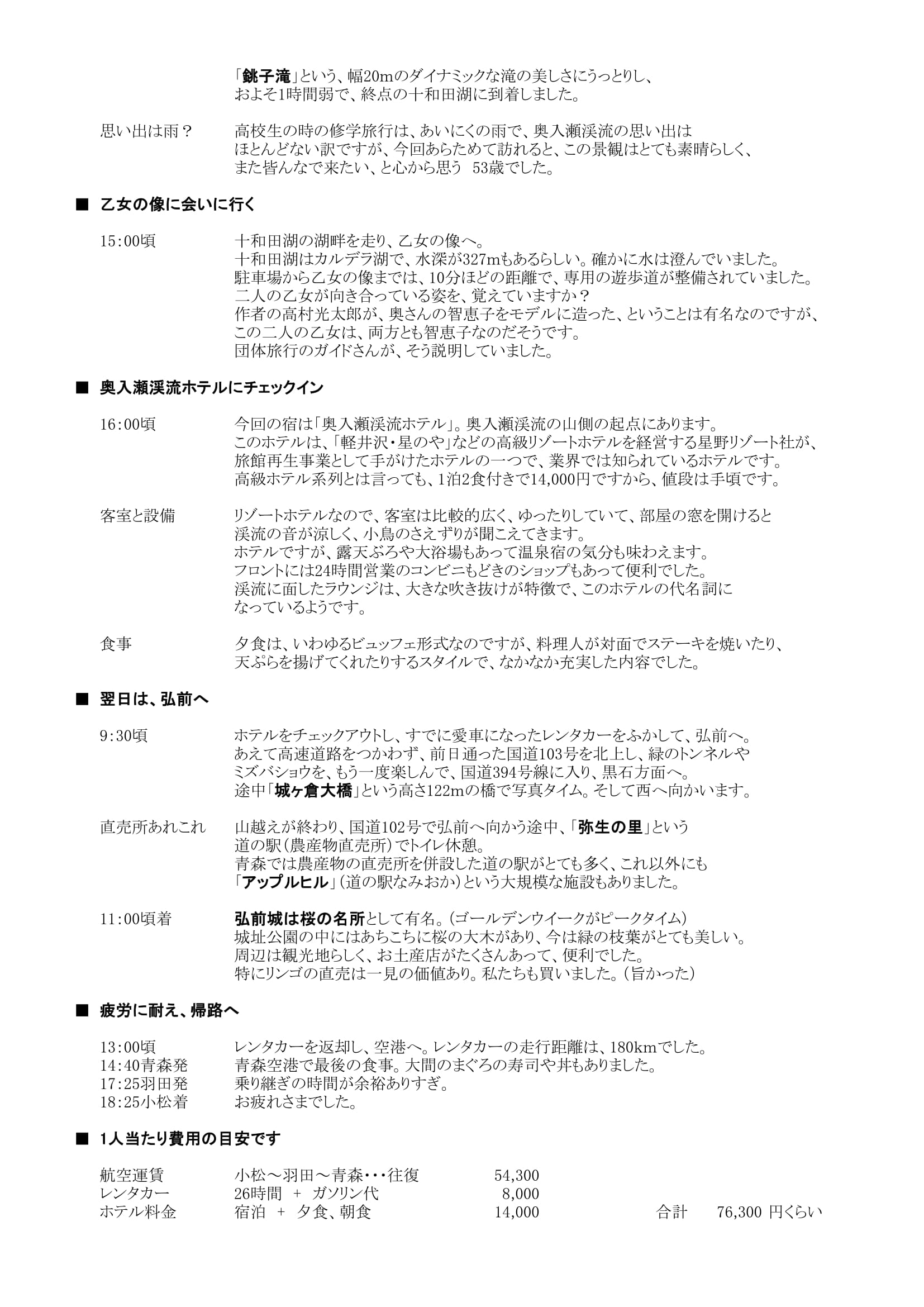 小松~羽田~青森~八甲田~奥入瀬~弘前~青森~羽田~小松