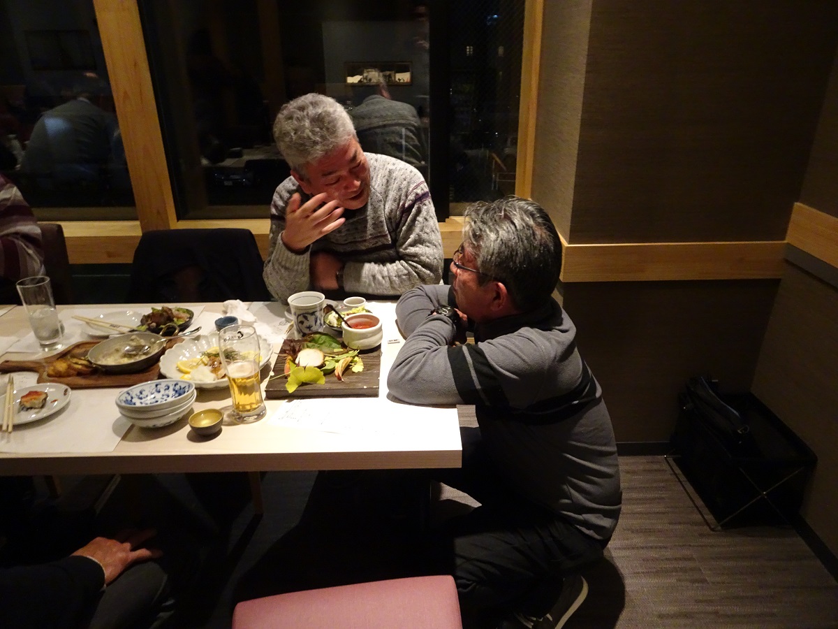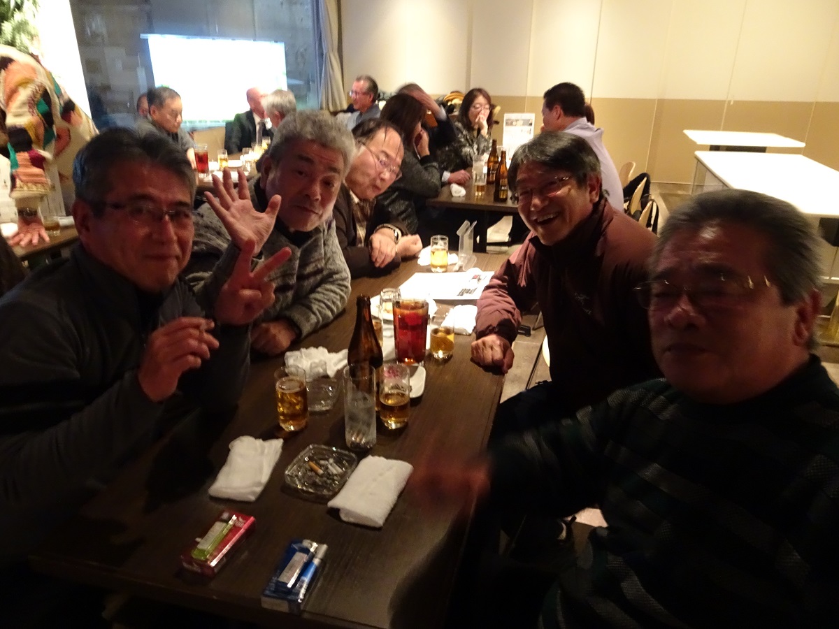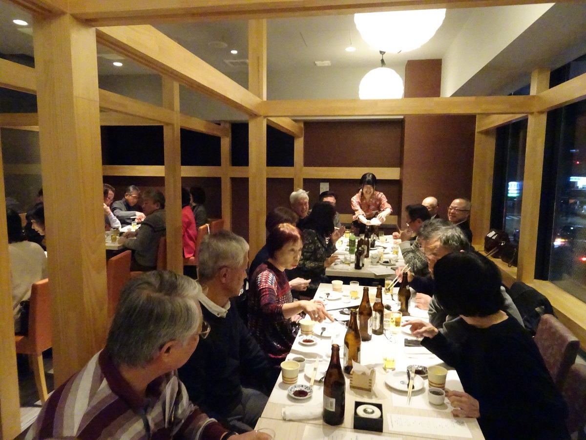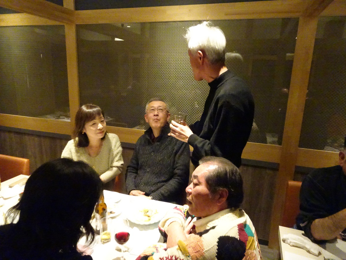 そしてプログラムは、恒例の「酔っぱらう前の記念撮影」へ進み、次回A面実行委員長のM田くんによる乾杯で、忘年会がスタート。最初の料理が提供されるタイミングで、料理長が登場し今夜の料理の説明やコメントを披露してくれました。料理やアルコールも加わって、会話が一段とヒートアップしていきます。自分の席を立ってあっちこっちで笑顔が広がります。まぁ、63歳の飲み会とはいえ、みんな元気で楽しそうです。