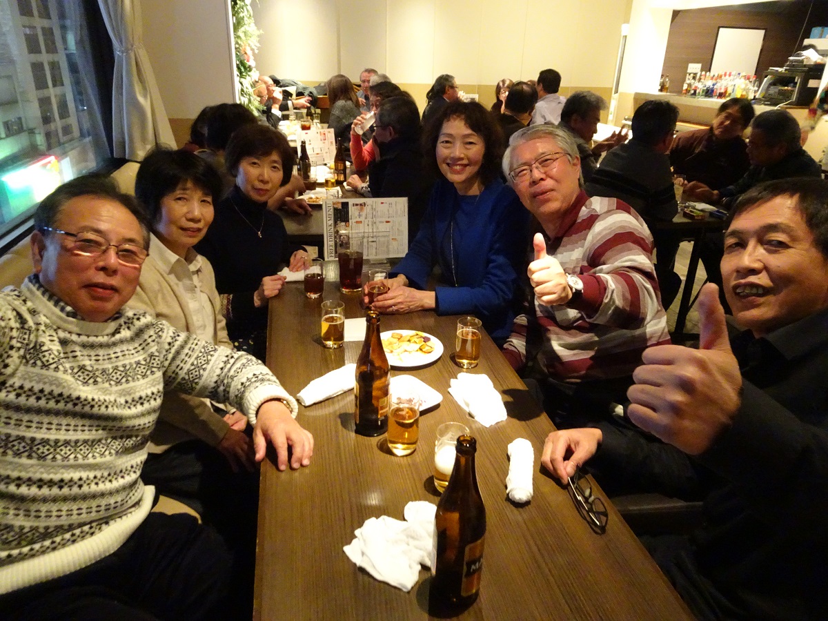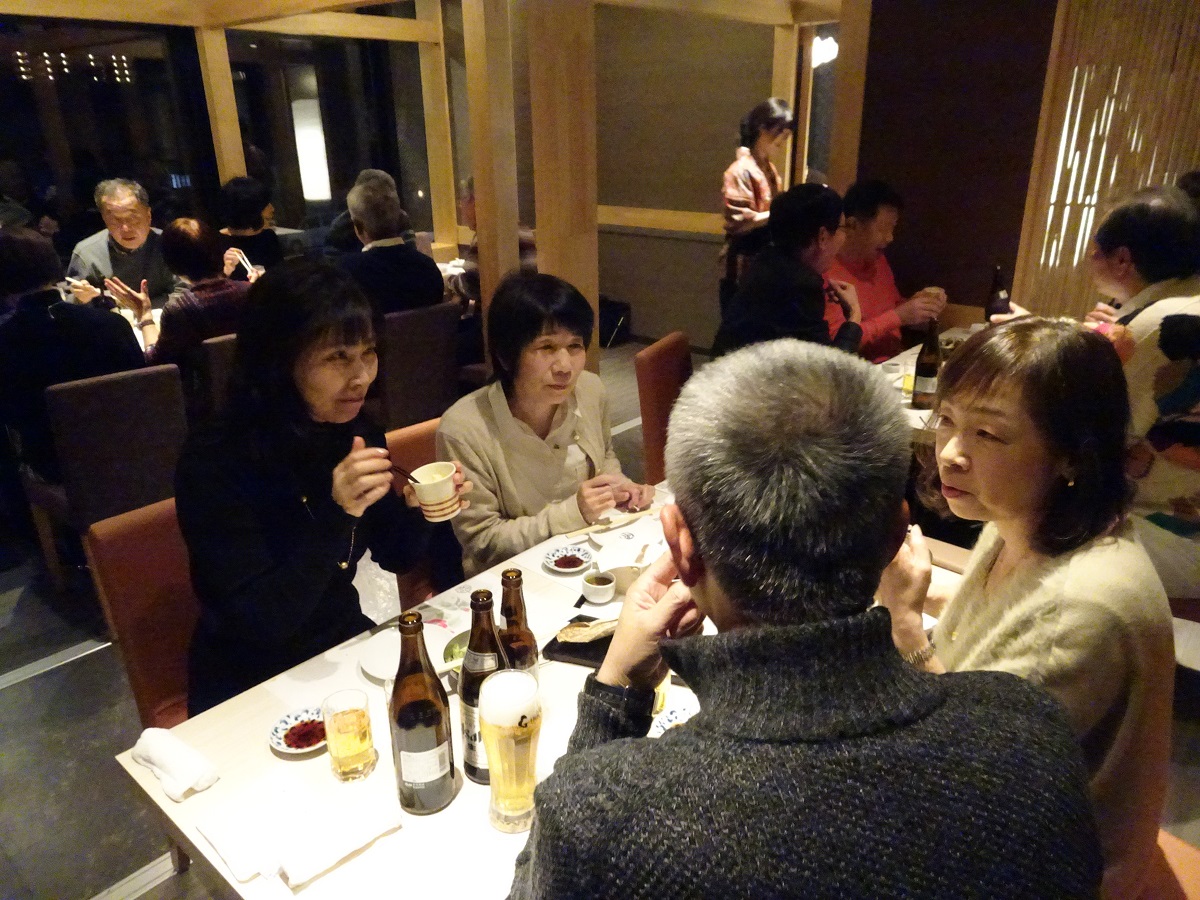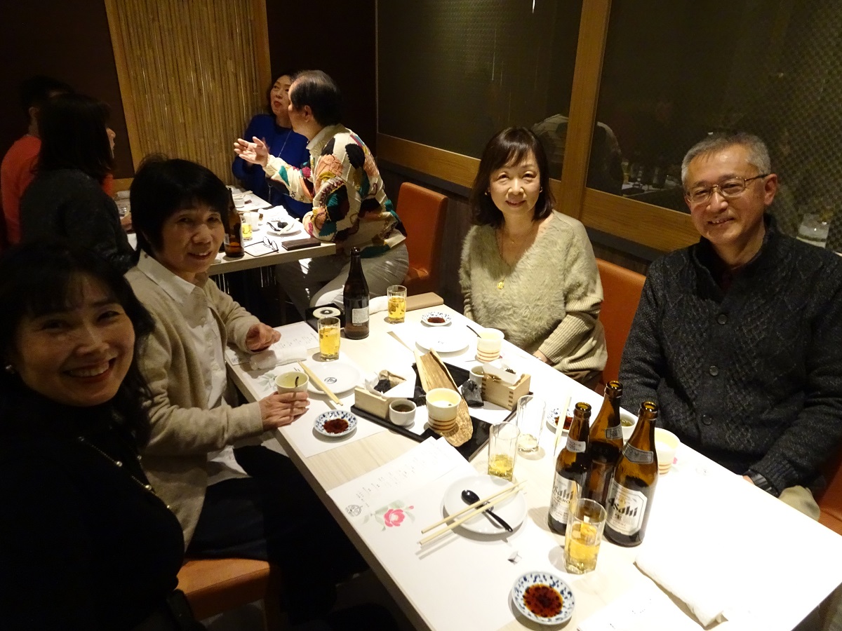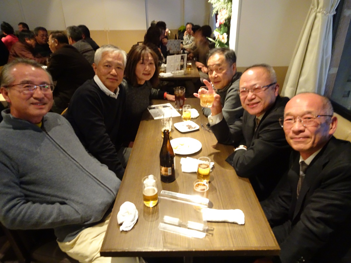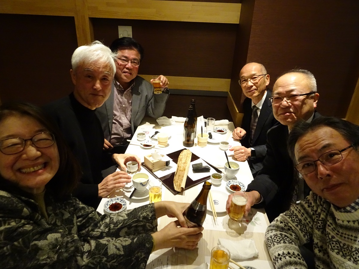 そしてプログラムは、恒例の「酔っぱらう前の記念撮影」へ進み、次回A面実行委員長のM田くんによる乾杯で、忘年会がスタート。最初の料理が提供されるタイミングで、料理長が登場し今夜の料理の説明やコメントを披露してくれました。料理やアルコールも加わって、会話が一段とヒートアップしていきます。自分の席を立ってあっちこっちで笑顔が広がります。まぁ、63歳の飲み会とはいえ、みんな元気で楽しそうです。
