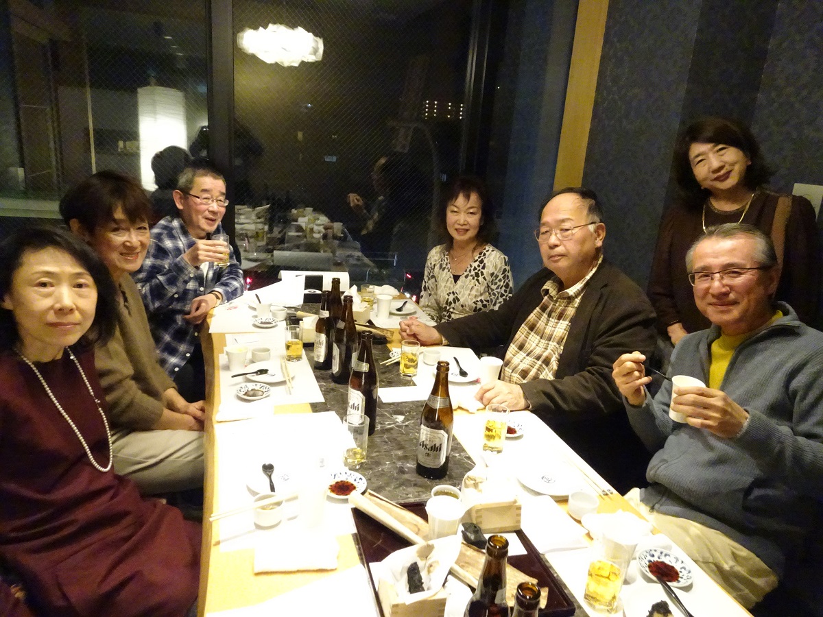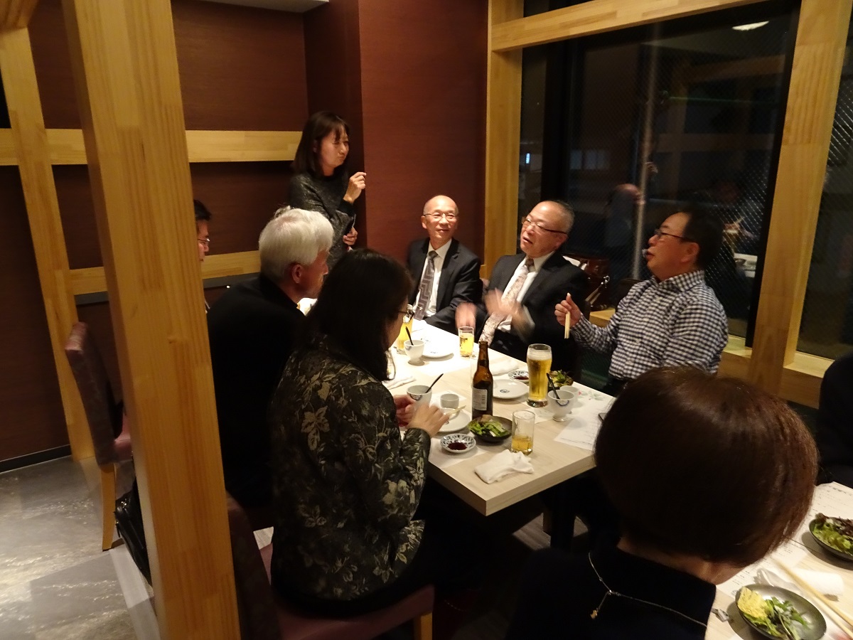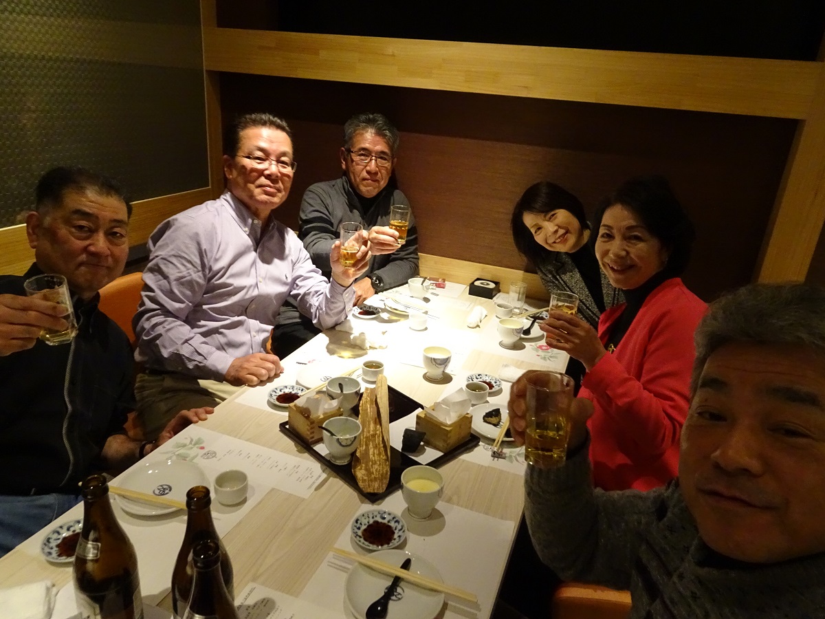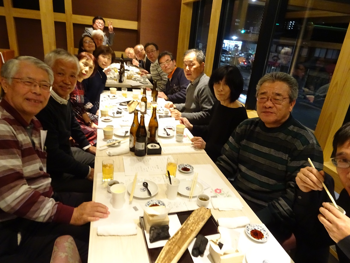 そしてプログラムは、恒例の「酔っぱらう前の記念撮影」へ進み、次回A面実行委員長のM田くんによる乾杯で、忘年会がスタート。最初の料理が提供されるタイミングで、料理長が登場し今夜の料理の説明やコメントを披露してくれました。料理やアルコールも加わって、会話が一段とヒートアップしていきます。自分の席を立ってあっちこっちで笑顔が広がります。まぁ、63歳の飲み会とはいえ、みんな元気で楽しそうです。