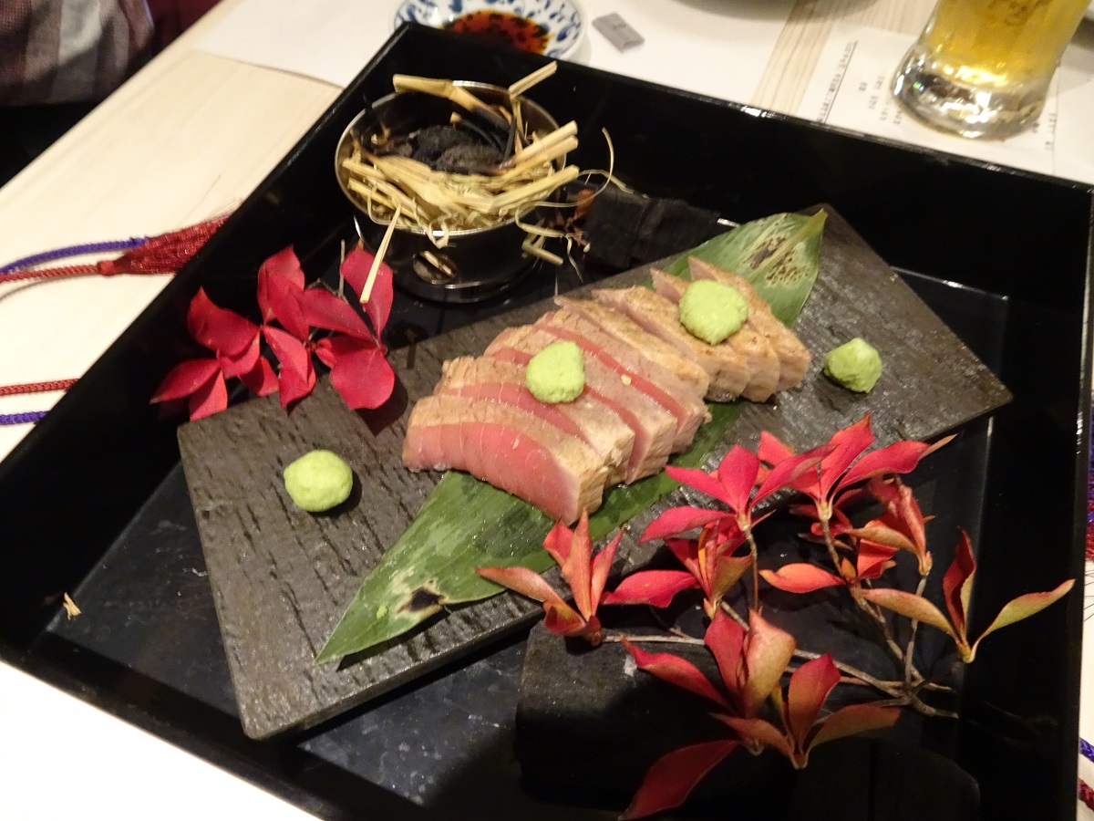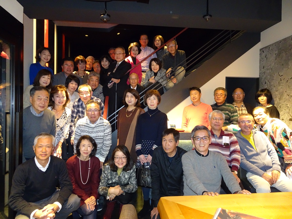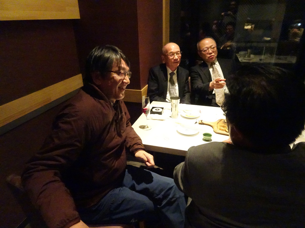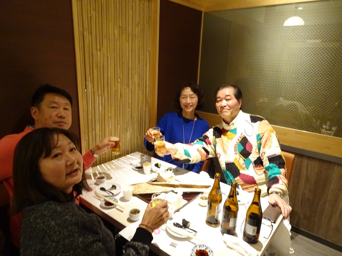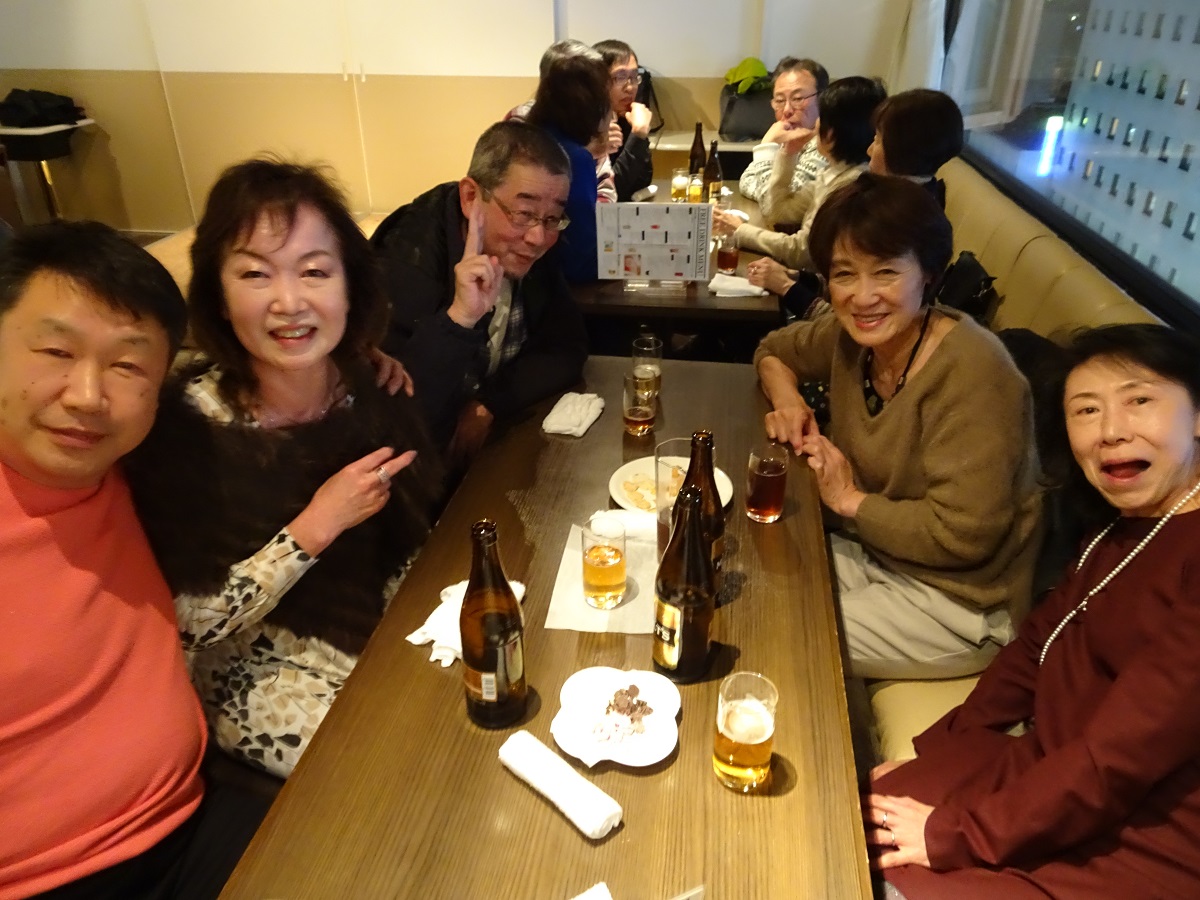 そしてプログラムは、恒例の「酔っぱらう前の記念撮影」へ進み、次回A面実行委員長のM田くんによる乾杯で、忘年会がスタート。最初の料理が提供されるタイミングで、料理長が登場し今夜の料理の説明やコメントを披露してくれました。料理やアルコールも加わって、会話が一段とヒートアップしていきます。自分の席を立ってあっちこっちで笑顔が広がります。まぁ、63歳の飲み会とはいえ、みんな元気で楽しそうです。