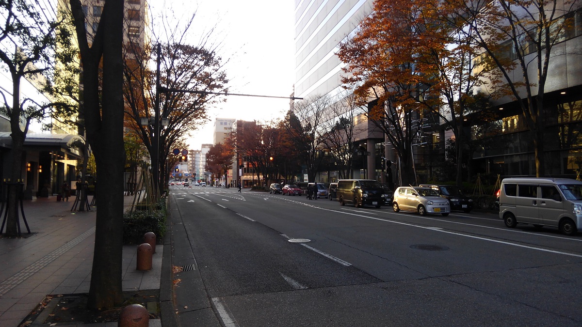 金沢駅前の大通りは夕方だというのに車が少なくて、紅葉が残る街路樹が夕日に映えていました。2019年11月30日(土)初めての企画「27期の忘年会2019」の1次会には合計38人の仲間が集合しました。