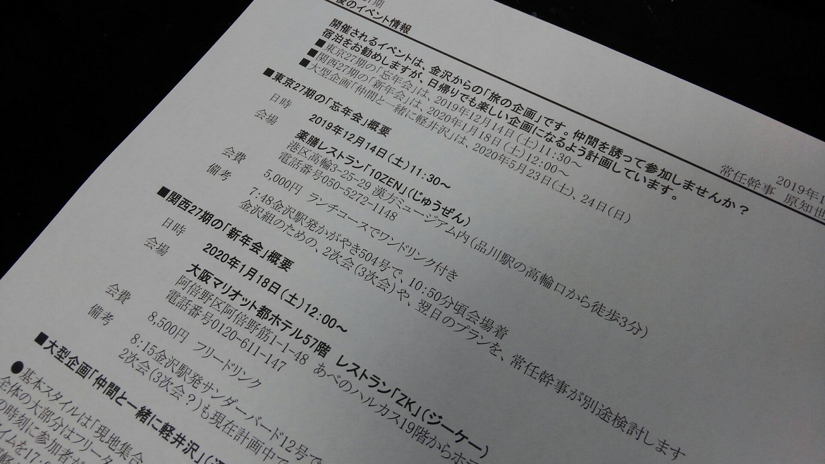 定刻の少し前から、参加者が順に集まり始め、受付して席に着くはずなのに誰も座らず、みんな立ったまま近況を交歓していました(笑)。ほぼ参加者が揃ったのを見計らって、最初のプログラム「今後のイベント予定」の解説です。東京27期の忘年会、関西27期の新年会、そして来年5月の通称「軽井沢大会」の概要説明、つまり「この指とまれ」の勧誘の時間です。残念ながら東京忘年会は休止(仕切り直し)となりましたが、関西27期の新年会には、金沢からも10人以上が出席することになりました。来年の目玉企画「軽井沢大会」の情報は今後も公式ホームページで継続的に公開されていくことになりました。