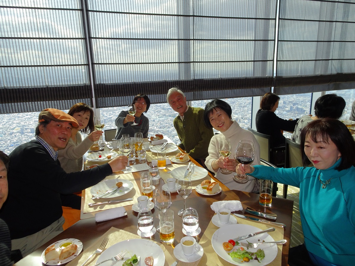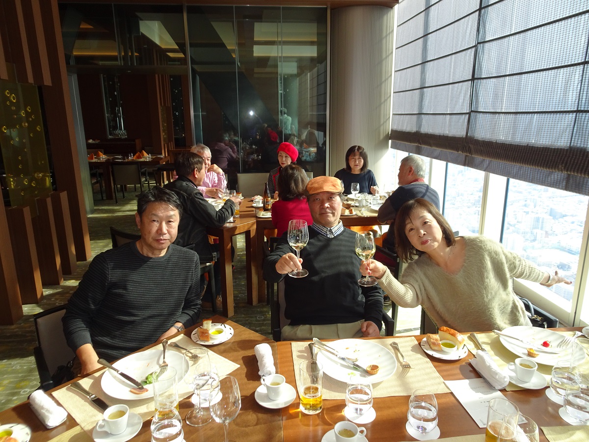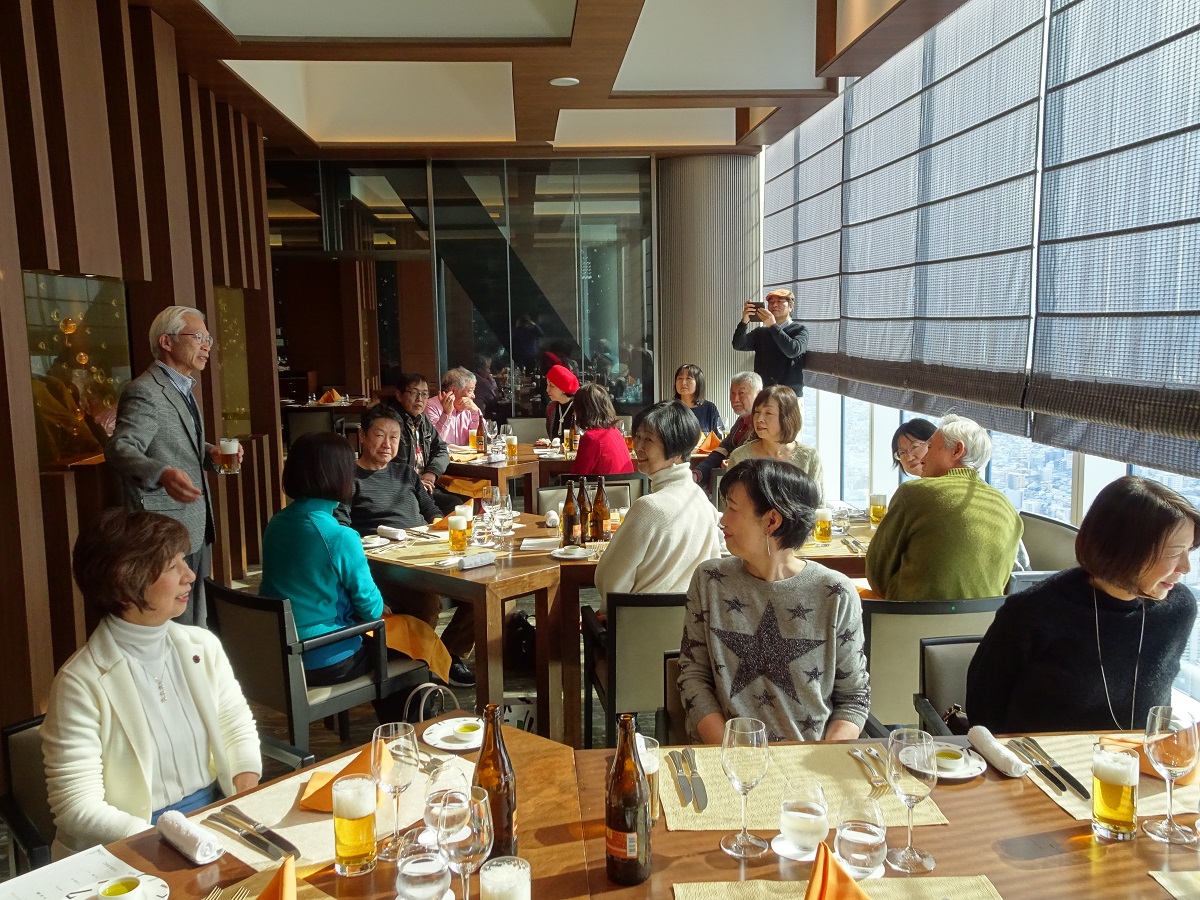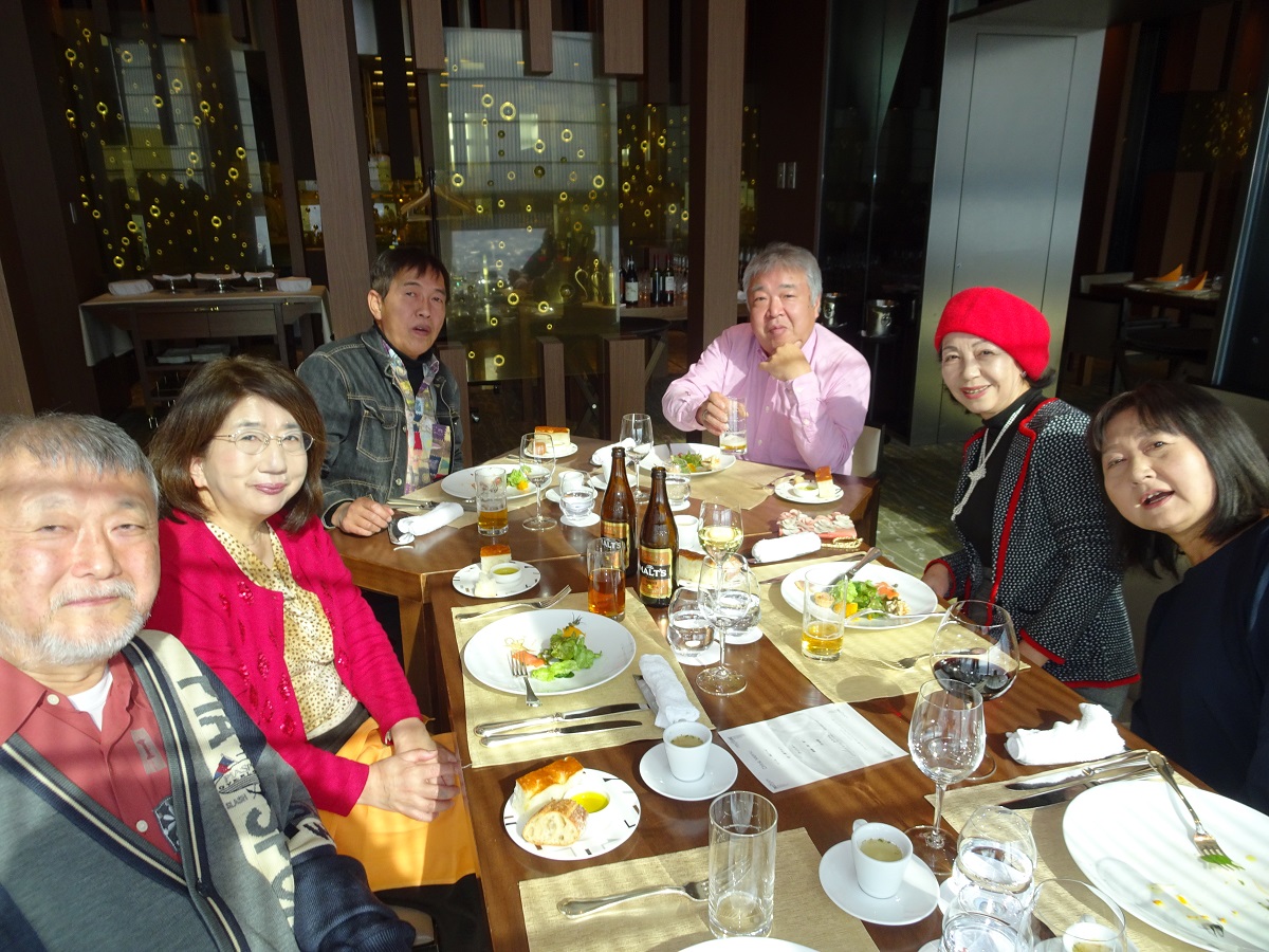 1次会の会場は、マリオット大阪57階のダイニング「ZK」(ジーケー)だ。あべのハルカスの19階にあるフロント階には広いラウンジがあって、すでに利用客で溢れていた。さらにホテル専用エレベーターで57階へむかうと、眼下に大阪の街並みがミニチュアのように広がっていた。会場のレストランにはたくさんのブースがあるのだが、どうやら、どのテーブルからも眺望が楽しめるようだ。受付あたりでは、夏の京都企画以来の再会を喜ぶ女性陣の会話が続いていた(笑)。H二三くんによる乾杯から、サラダ、前菜とコースが進むころには、みんなグラスを持ったまま席を移動して、いつもの27期スタイルになっていった(笑)。