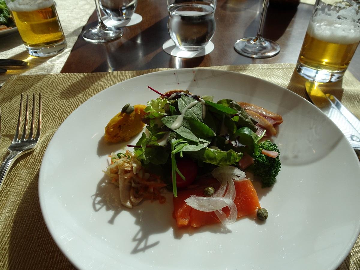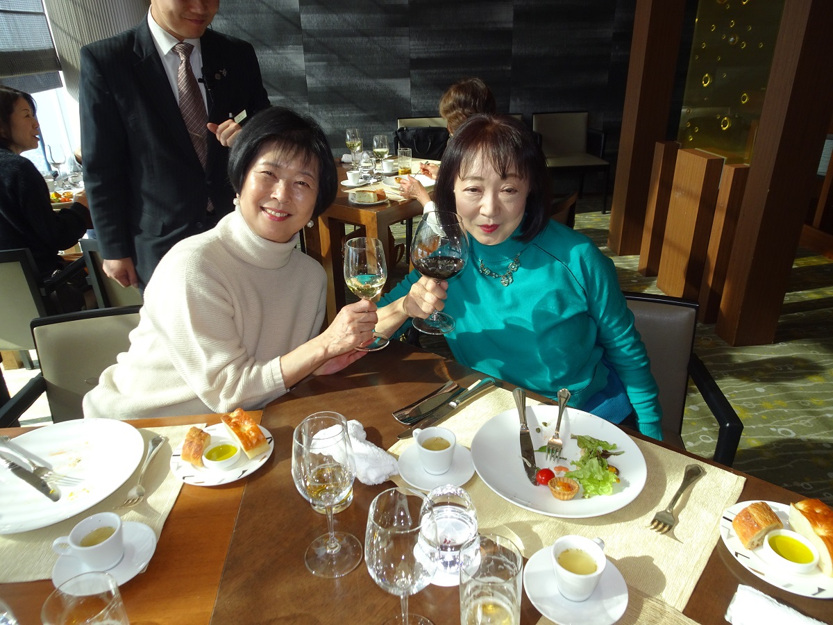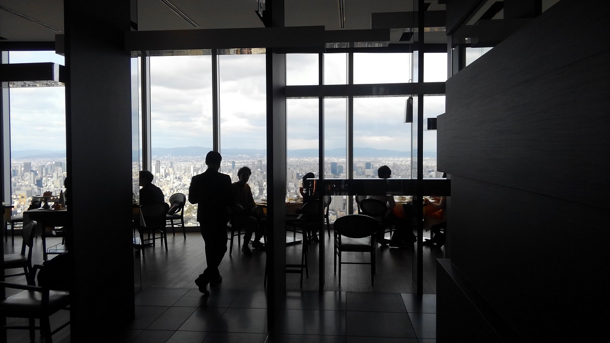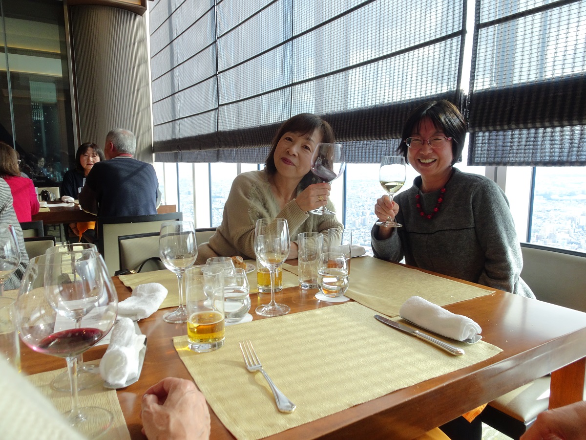 1次会の会場は、マリオット大阪57階のダイニング「ZK」(ジーケー)だ。あべのハルカスの19階にあるフロント階には広いラウンジがあって、すでに利用客で溢れていた。さらにホテル専用エレベーターで57階へむかうと、眼下に大阪の街並みがミニチュアのように広がっていた。会場のレストランにはたくさんのブースがあるのだが、どうやら、どのテーブルからも眺望が楽しめるようだ。受付あたりでは、夏の京都企画以来の再会を喜ぶ女性陣の会話が続いていた(笑)。H二三くんによる乾杯から、サラダ、前菜とコースが進むころには、みんなグラスを持ったまま席を移動して、いつもの27期スタイルになっていった(笑)。