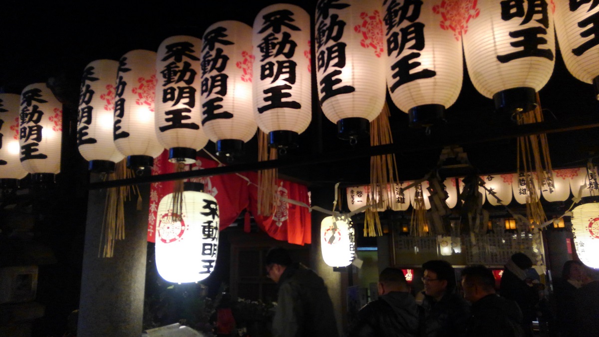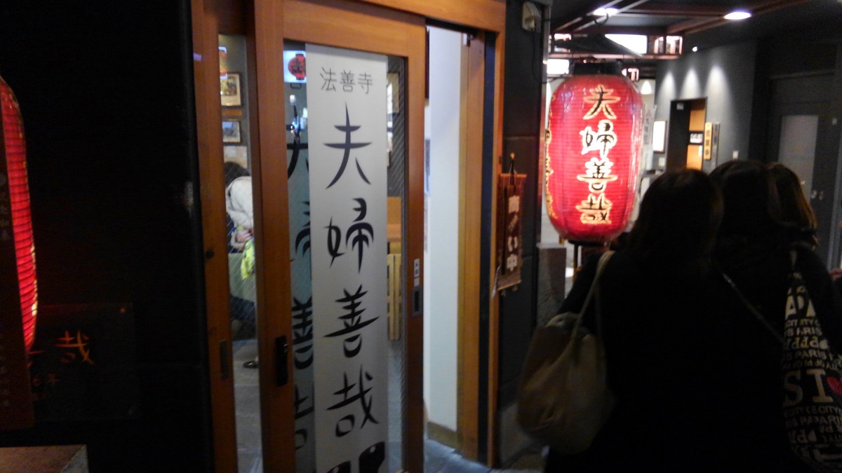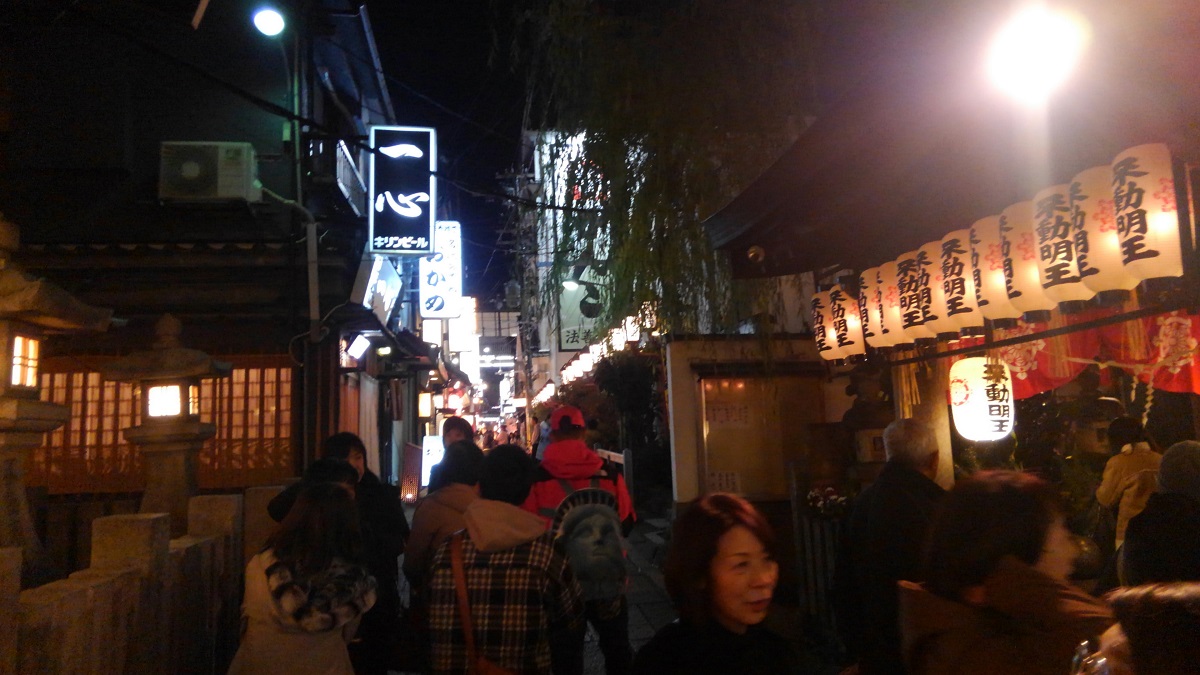法善寺横丁は、人でごった返していた。そして誰もが、その小さな神社にお参りしている。賽銭を入れた後に、願い事はひとつだけ、と聞いて少々戸惑った(笑)。列について、前の人を観察すると、左右の苔の塊と正面の苔の壁に、水をかけている(笑)。それをマネして水をかけ、お参りした。これが有名な水かけ不動?と聞いたのは、お参りした後のことだ。さっき水をかけた苔の塊は、お地蔵さんと不動明王なのだそうだ。暗くて分からなかったと言い訳するしかなかった(笑)。