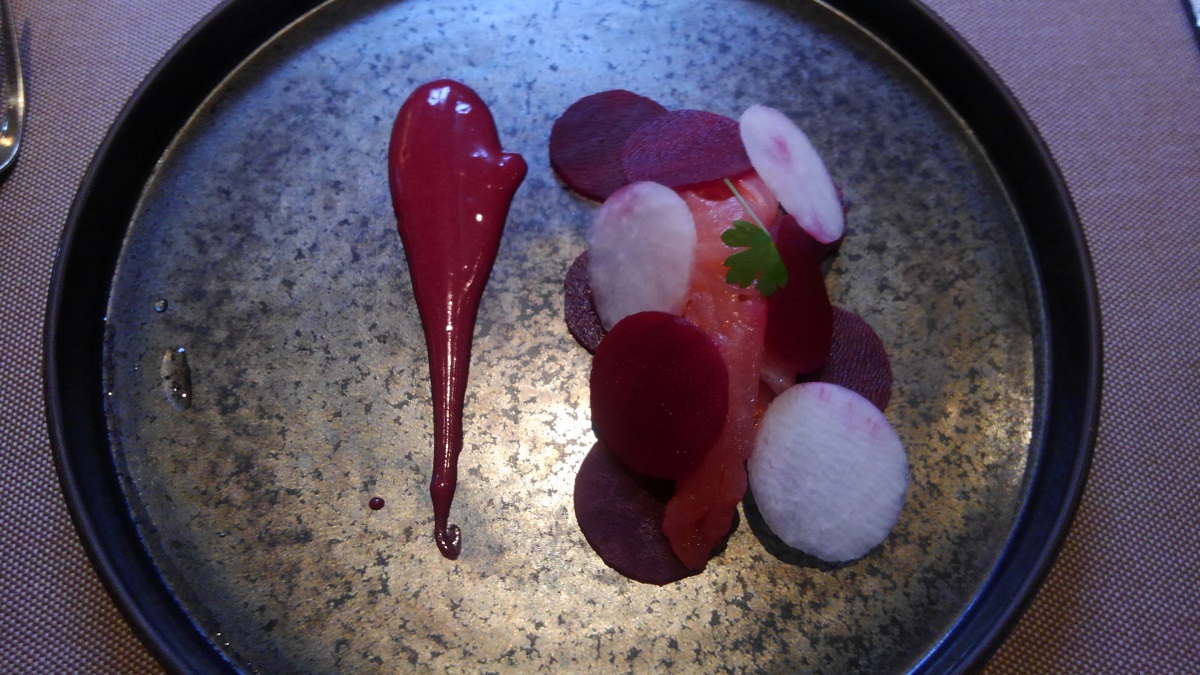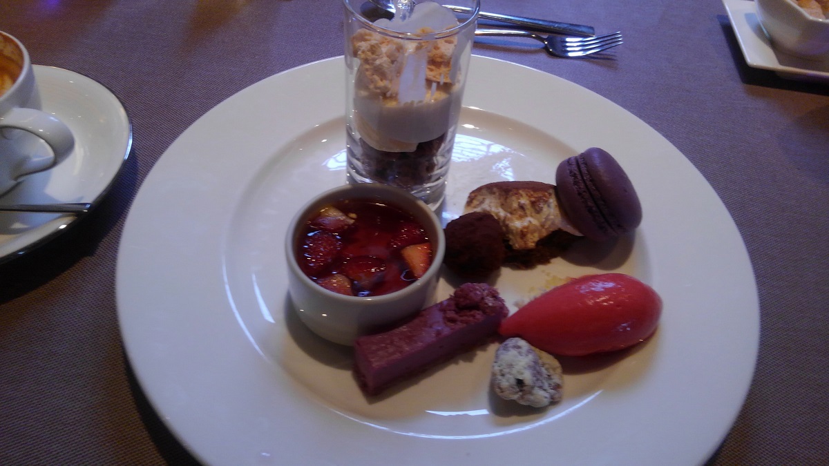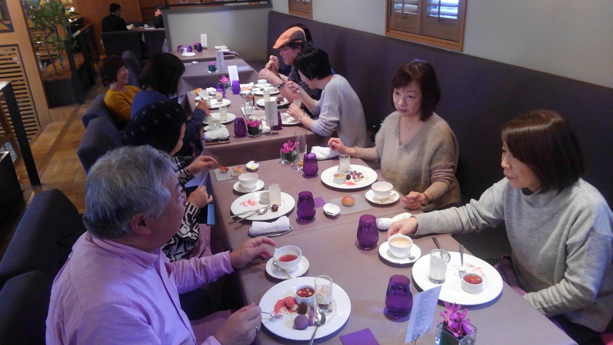 このレストランのテーマカラーは店名にならって「すみれ色」のようだ。そんなテーブルウエアも鮮やかに見える。参加者は好きな飲み物を注文し、今日は何してた?、などと楽しい会話の始まりだ。料理はイタリアンのランチコースで、前菜は「すみれ色」を想起させる盛り付けだった。パスタ、メインも美味しかったが、最後のドルチェが特に秀逸だった。利用客が女性ばかりなのも納得できる。今回の旅は最後まで楽しくて、おなか一杯、満足できた(笑)。