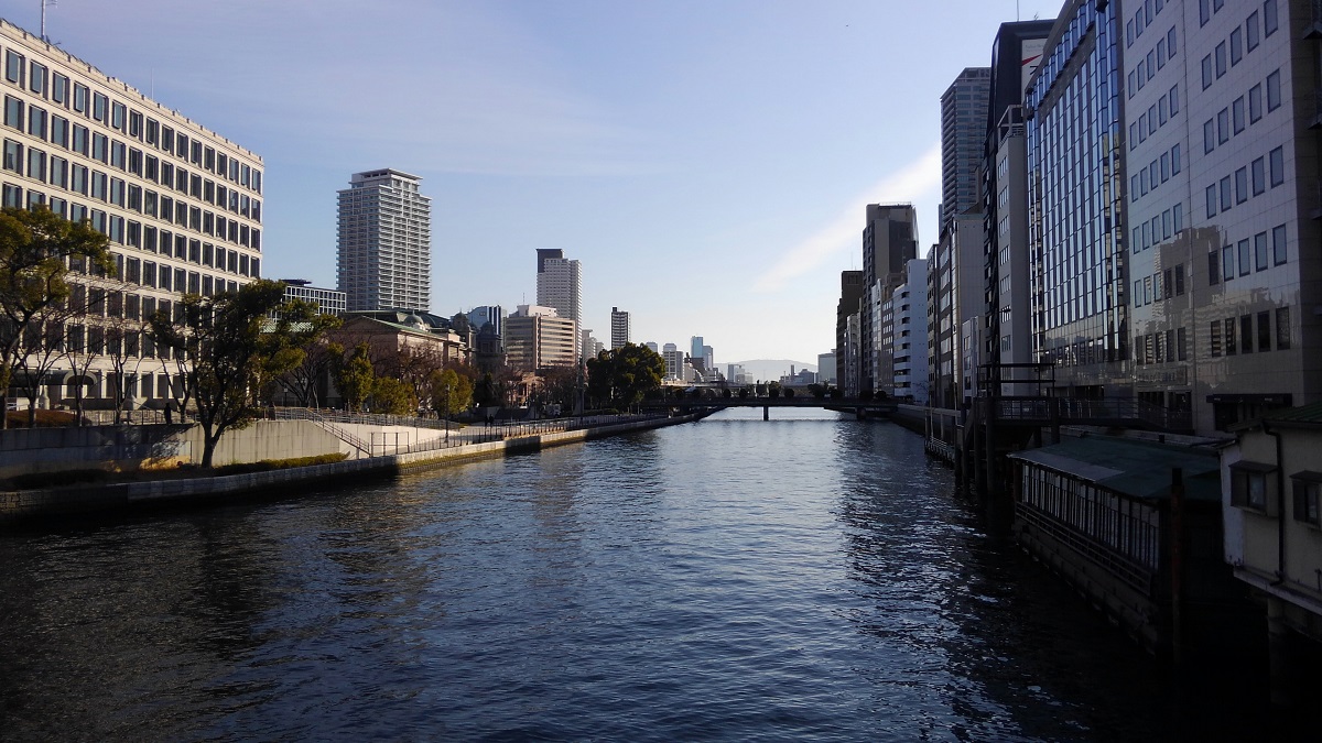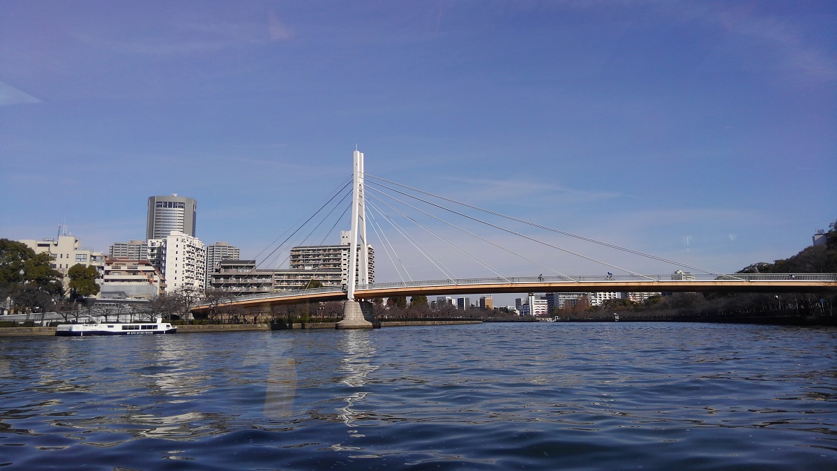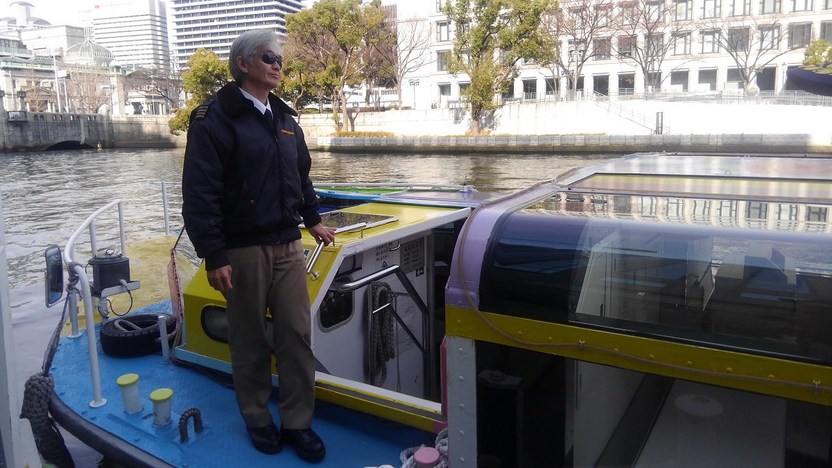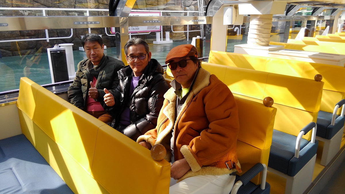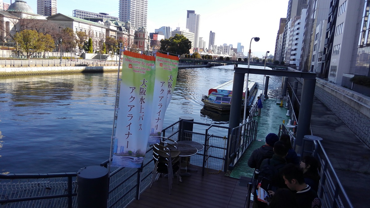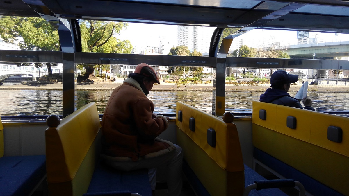 次の遊びは、水上バス「アクアライナー」だ。昨晩の3次会でT村さんに教えてもらい、乗ってみることにしていた。さっきの淀屋橋には、その発着所がある。足早に戻ってギリギリ乗船に間に合った。どうやら、大阪城や中之島周辺を、水辺から楽しむ1時間ほどのクルーズだ。いくつかの発着場を周遊するのだが、水面のあたりから見える橋や街並みの景色はとても面白かった。桜の頃はさぞかしきれいだろう。大阪城の発着場では多くの乗客が入れ替わる。ほぼインバウンドだ。大阪城は彼らの人気スポットで、きっとここが水上バスの起点なのだろう。一周して淀屋橋に戻り、ここからランチ会場まで、ブラブラ歩くことにした。橋を渡り、市役所前のオブジェを観たりしながら、方向はこっちだ、とリーダー役の僕が指し示す方向へ、おっさん3人で進んでいった。