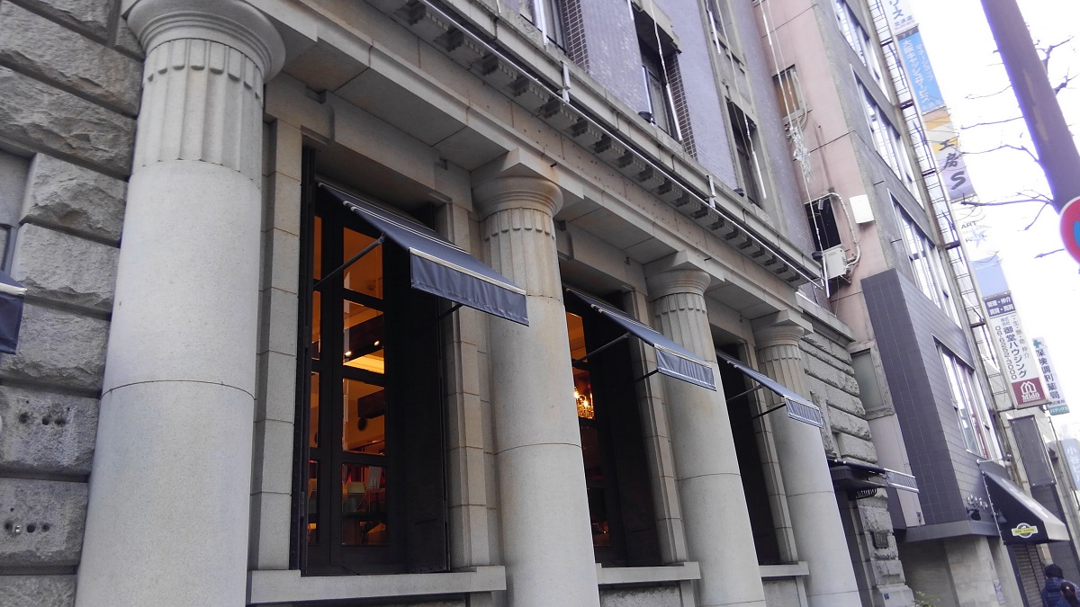 北浜エリアには、大阪証券取引所があった(あの五代さまの像がある)。東京の兜町と同じで、金融や証券の中心地のようだ。古くからのビジネス街ということなのだろう。だから、街には明治や大正時代を思わせる古いレトロなビルが、たくさん残っている。ケーキショップの「五感」も、そんなレトロなビルに本店を構えている。古い銀行の吹き抜けを思わせる店内の2階に目的のカフェがある。