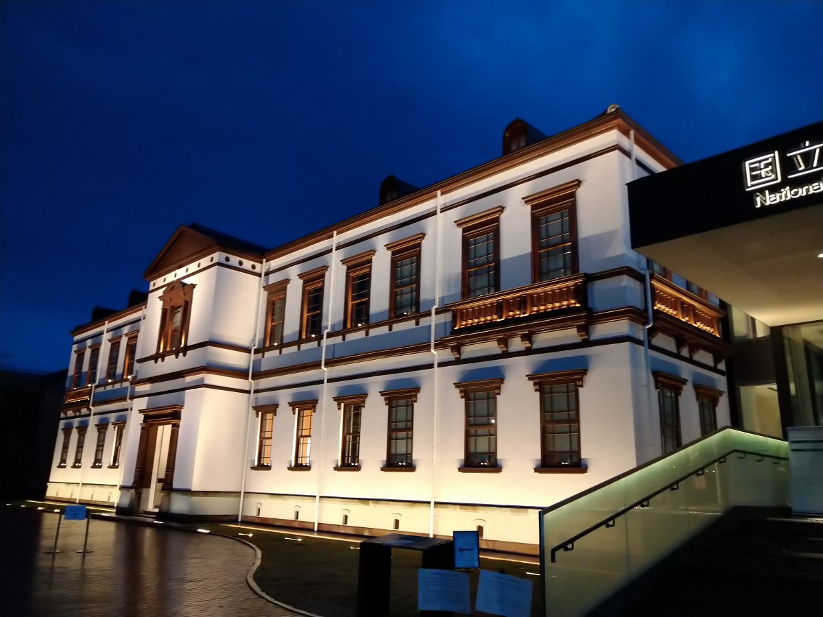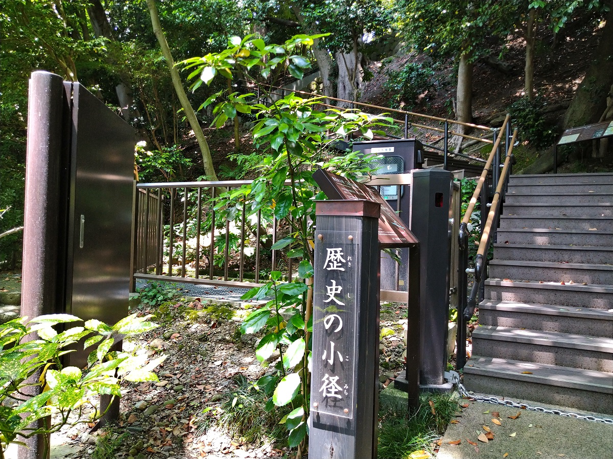 外の雨は少し強くなったようだ。3人で外周の回廊を進み、雨で濡れる石畳を歩いて、本多公園へと入っていった。ここから「美術の小径」を歩き、「歴史の小径」の狭い階段を右手に登ると、森の出口に目的地が見える。散歩の最後は、できたばかりの「国立工芸館」を楽しもうと思う。