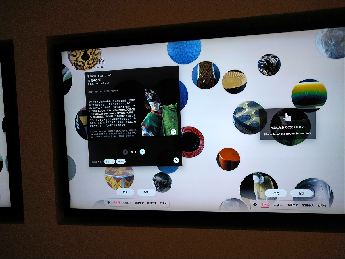 この日の企画展は「素材・わざ・風土」の視点で、工芸の世界を観るというテーマらしい。入り口近くのブースには、大きなタッチパネルの案内板があって作品の情報を予習できたり、ダウンロードしたアプリで解説をしてくれたり、まぁ色々と現代風なのだ。