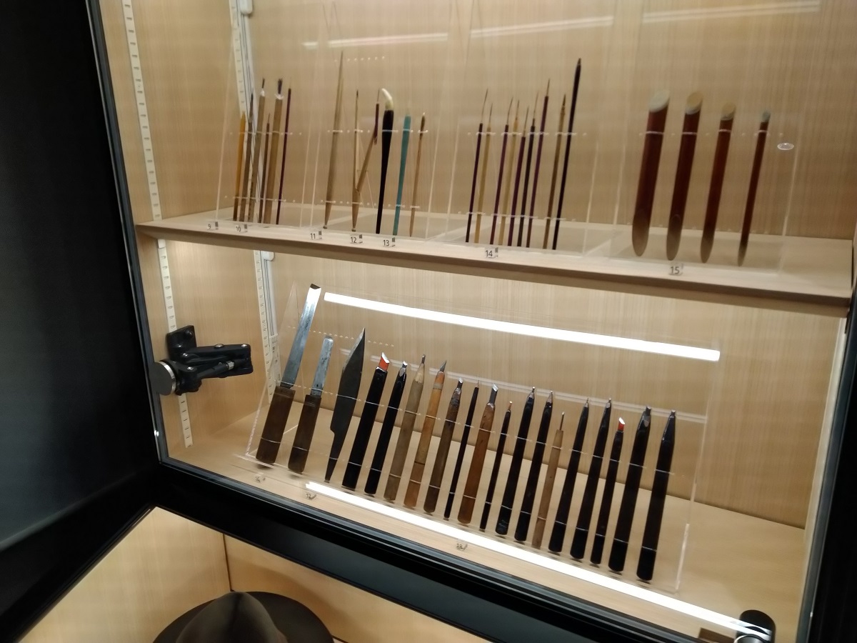 工芸の細かなジャンル(陶磁器、ガラス、漆工、木工、竹工、染織、人形、金工)ごとに、ブースが設置され、作品が展示されている。ここの収蔵品は明治以降のものばかりなのだそうだ。中でも、金沢出身の人間国宝、蒔絵師の村田権六さんのブースは圧巻だった。そこに村田さんの「仕事場」が再現され、使っていた道具なども展示されている。30分ほどの映像で観る「村田さんの手元の作業」には、ミクロの世界を操る神の手の凄みすら感じた。