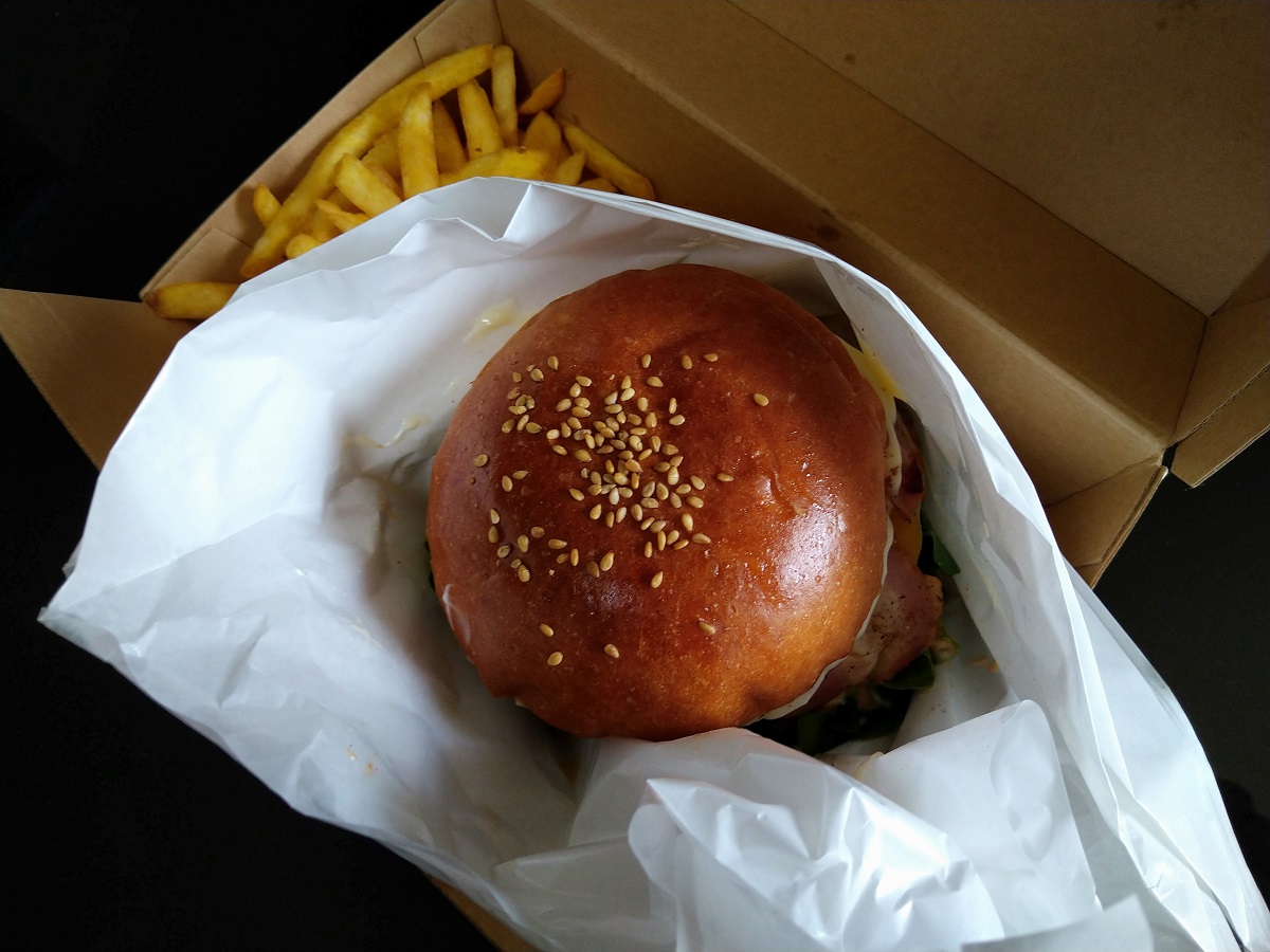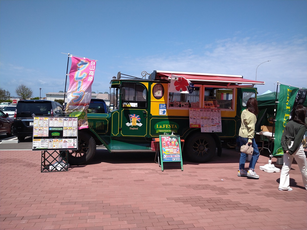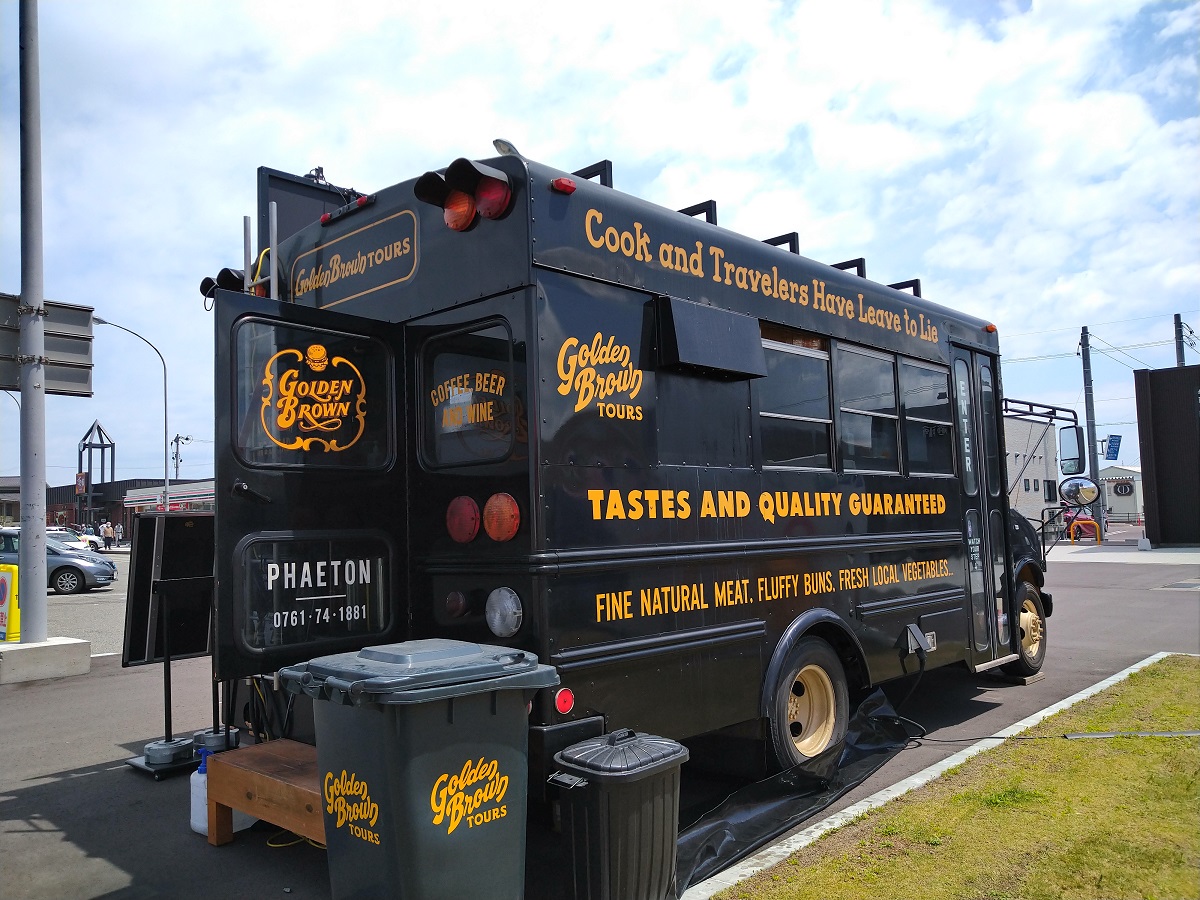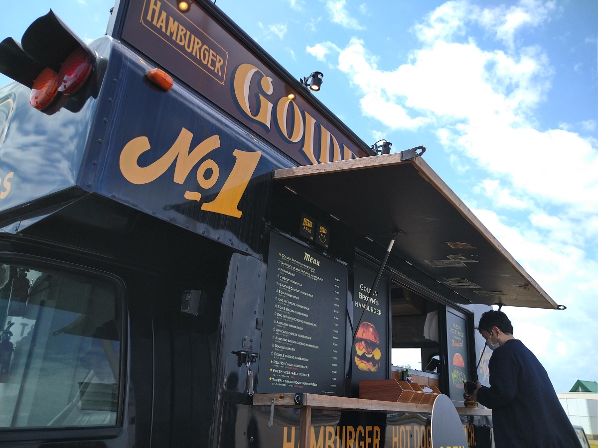 憲法記念日は晴天だが風の強い一日だった。あの「黄金のトイレ」がある北陸道の施設のパーキングには、たくさんのキッチンカーが停まっていた。焼きたてのスコーン、ピザ、クレープなど、顔ぶれも多彩で、GWの高速道路らしい風景だ。朝だから静かだが、きっと昼になったら、それなりの人出になるのだろう。僕たちのような地元の人は一般道側の駐車場から入っていく。今日の目当てはハンバーガーだ。出来たてをテイクアウトして自宅で朝ごはんにしようと思う。ごっついハンバーガーだから、きっとハイカロリーだな(笑)。
