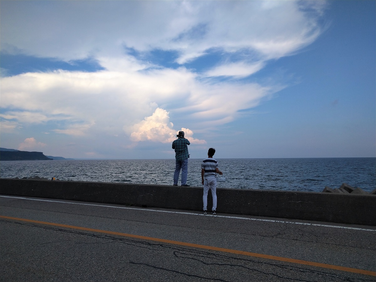 県境あたりの右手の海に小さな岩場を見つけた。まるでサザンの「えぼし岩」のように見える。さっきまでの明るい空が、雨雲で急に影ってきた。その方向の入道雲が妙にきれいに観えて、撮影隊長の勇者は急に空の撮影を始めていた。これが3番目の海だった。そして雨になり、山越えで七尾に入るころには結構強く降ってしまった。でも悪運が強い僕たちが和倉の「能登ミルク」に着くころには、雨は止み、和倉の海にはさざ波が立っていた。