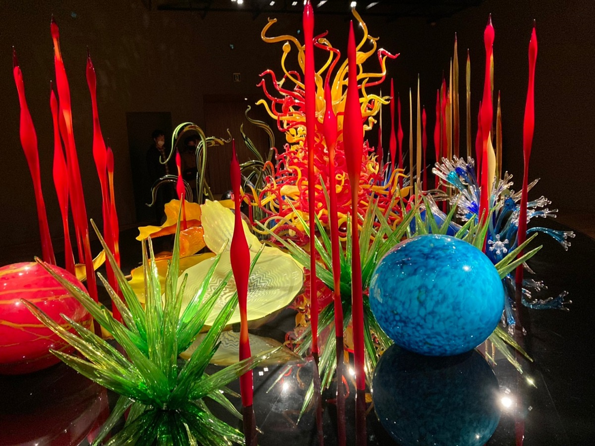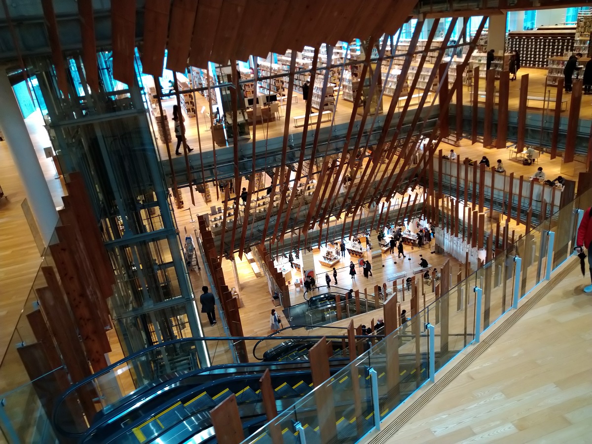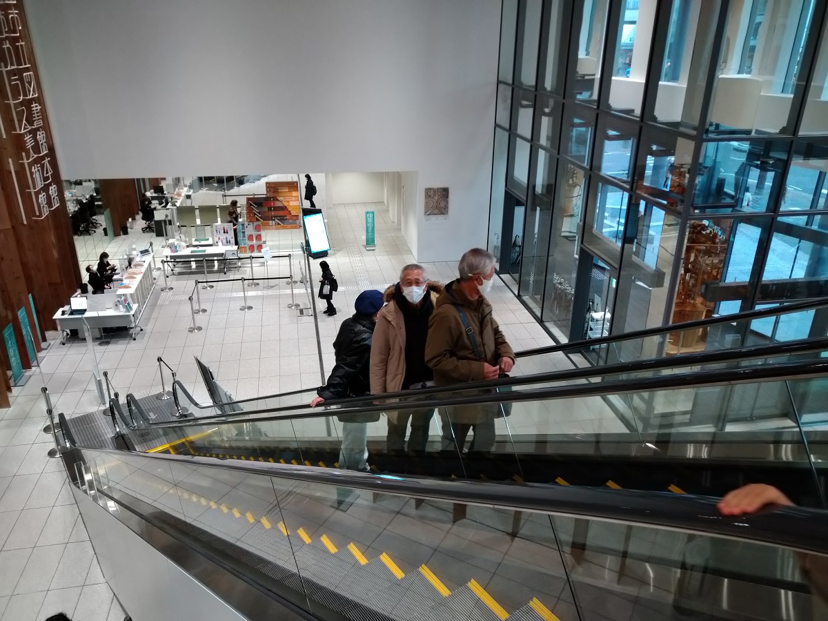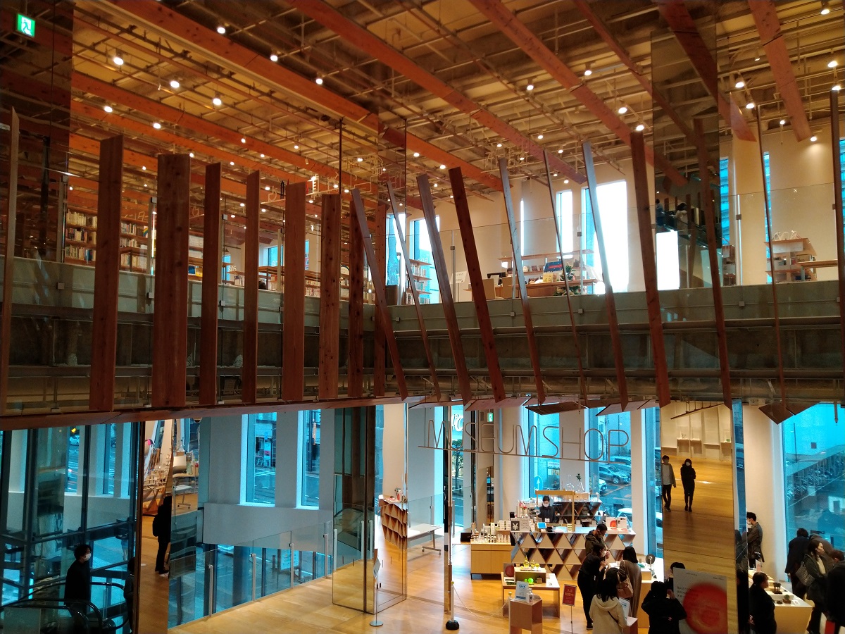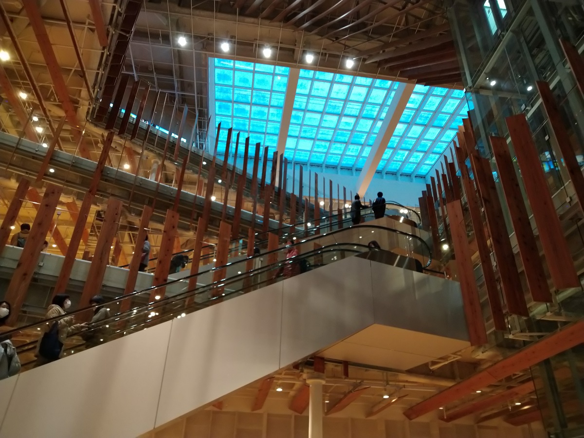 さぁここからは個別の時間だ。目当ての和菓子屋へ向かうやつ、ガラス美術館の常設展へ行くやつ、斬新な図書館エリアを選ぶやつ、それぞれバラバラだ。僕は個人的にこの施設(TOYAMAキラリ)の建物全体に興味があった。あの隈研吾さんが設計した「富山らしい空間」に身を置いてみたかった。富山産の杉の部材、ガラスの棚やテーブルや一部の作品、大きな吹き抜けを長いエスカレーターがシャープに空へと続く。そんな大胆にレイアウトされた空間に、富山の光が差し込むさまは、想像以上に美しかった。