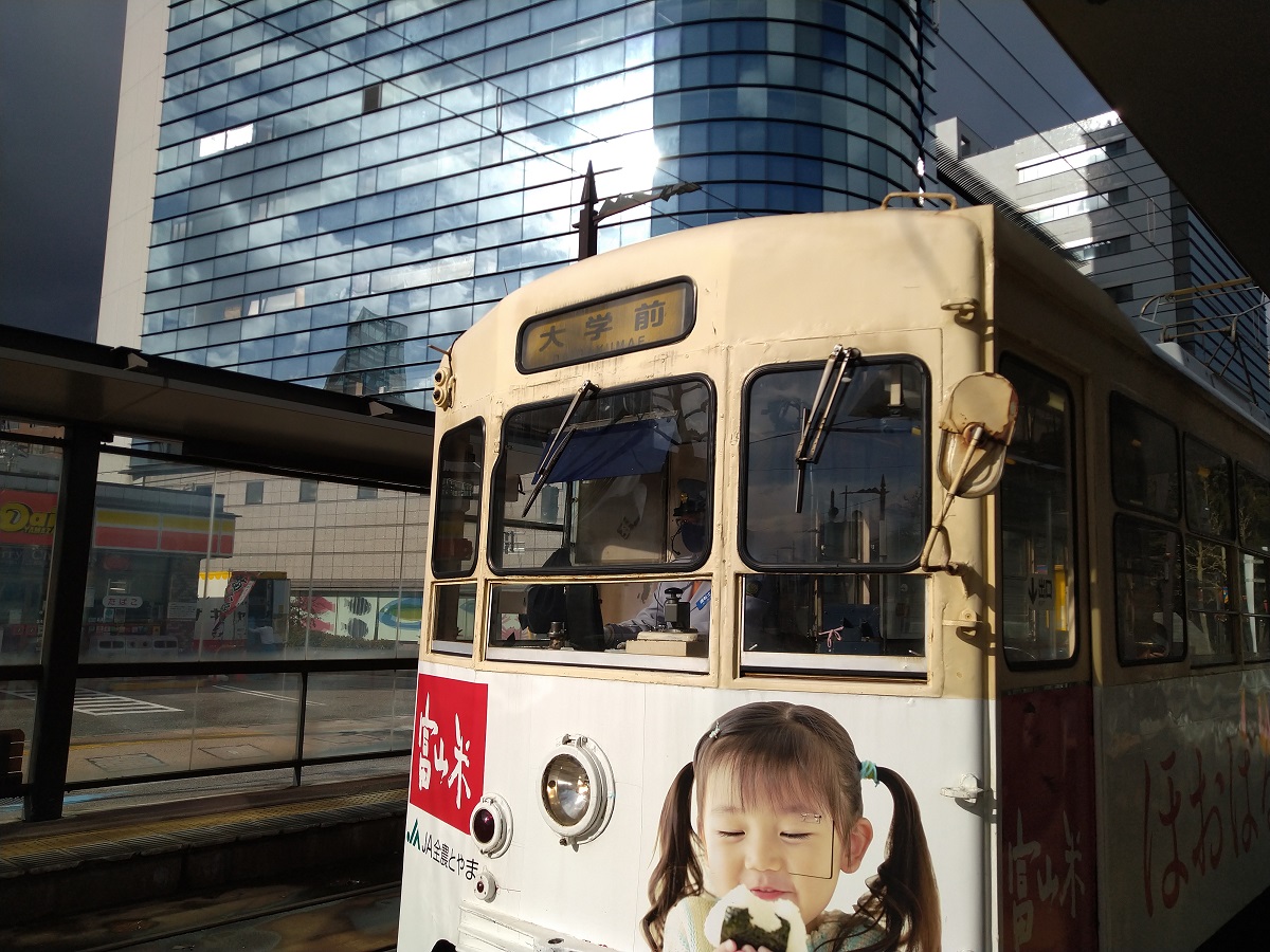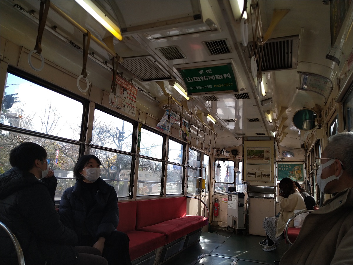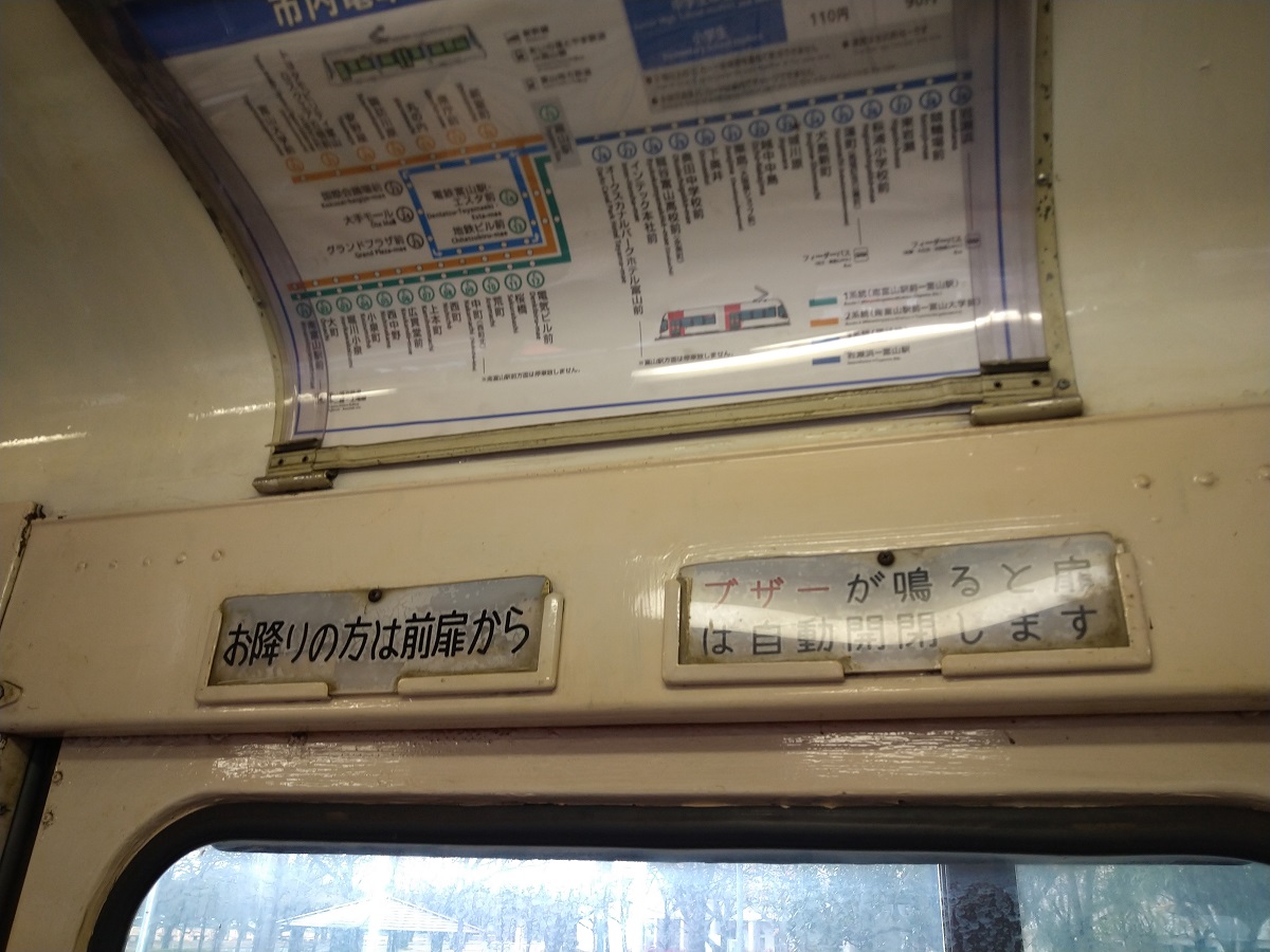 乗り込んだ路面電車は、狙っていた旧式のレトロ車両(チンチン電車)だったのだが、いわゆるラッピング車両なので懐かしさはない。まぁ車内の古さやブレーキ音がいい感じだ。最近の車両は新型ばかりでカッコいいのだが、あえて昔のやつに乗りたかった、だからラッキーだ。