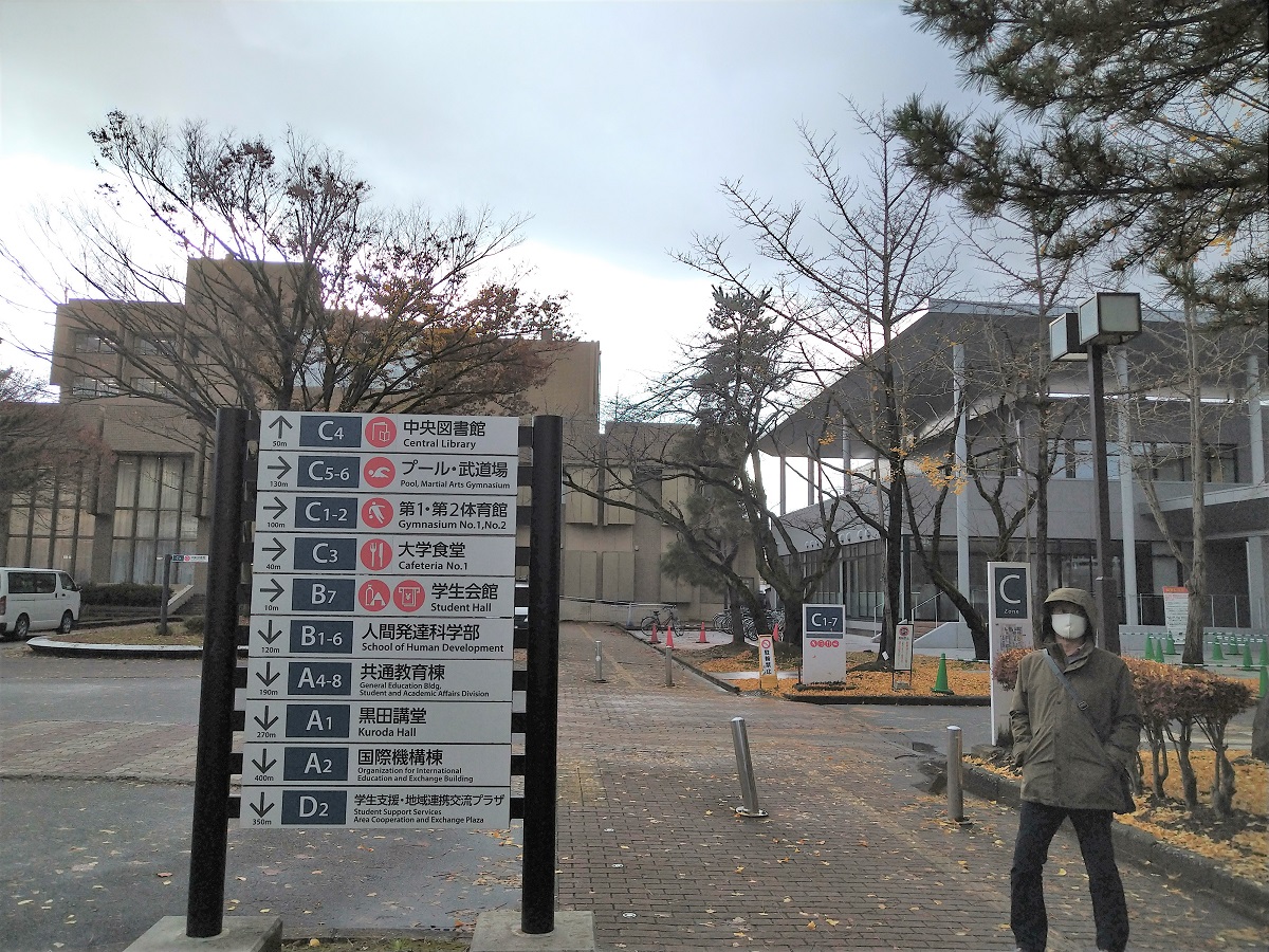 ちょっと遠慮がちに、大学の正門から構内に入っていった。卒業生のI本くんが先頭だ。たくさんの建物は全てきれいに変貌しているらしいが、この並木道や建物の位置は当時のままのようだ。参加できなかったもう一人の卒業生Y萩くんに写真を送った。当時の雰囲気が感じられるそうだ。並木道の最後には学生会館、食堂、図書館などがあるのだが、I本君は、このあたりでやっていた大学祭の催し物の記憶を話してくれた。