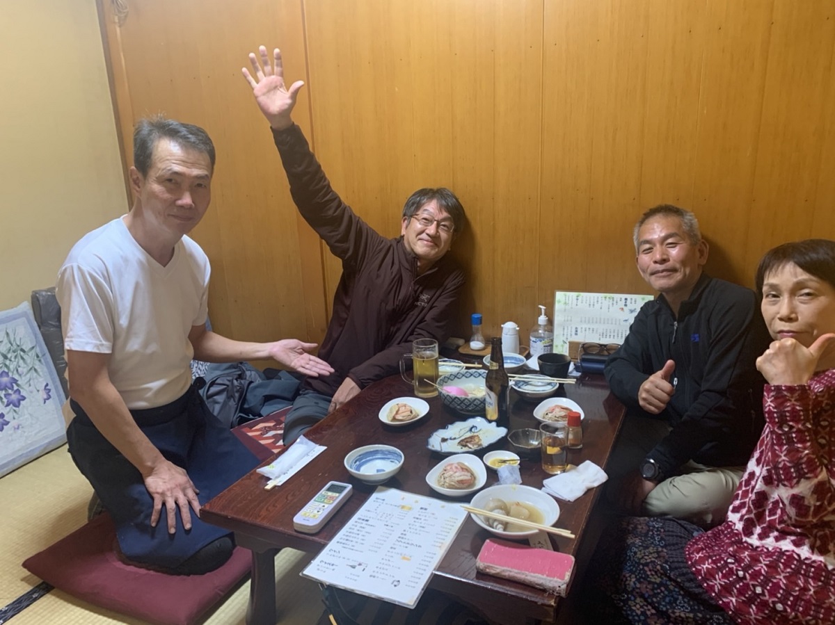 夜の部では、チェリー杯の納会が某ホテルで行われ、山楽会は「みひろ」に集まっていたらしい。それぞれの会場から、みんなの集合写真や横顔の投稿が始まっていた。富山にいたZ団は、夜になっても元気で飲んでるよ、と投稿したのだが、歩き疲れたカラダは正直で、居酒屋の半個室の椅子にだらりと座り込んでいた(笑)。