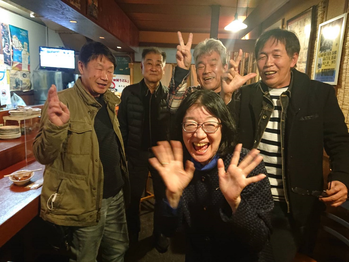僕たちは20時ごろ、みきやんに着いた。みきやんには、その段階で7~8人ほどの同級生が残っていた。東京から駆けつけてくれた笑顔のT野嬢が、一番奥の席にいて、僕たちを大きな声で迎えてくれた。遅くなってすまない。みんな待ちくたびれて、疲れているようにも見える(笑)。合流した僕たちもビールをもらい、無理やりみんなに乾杯を強要した。おっさんはこんな時、自己中心なのだ。
