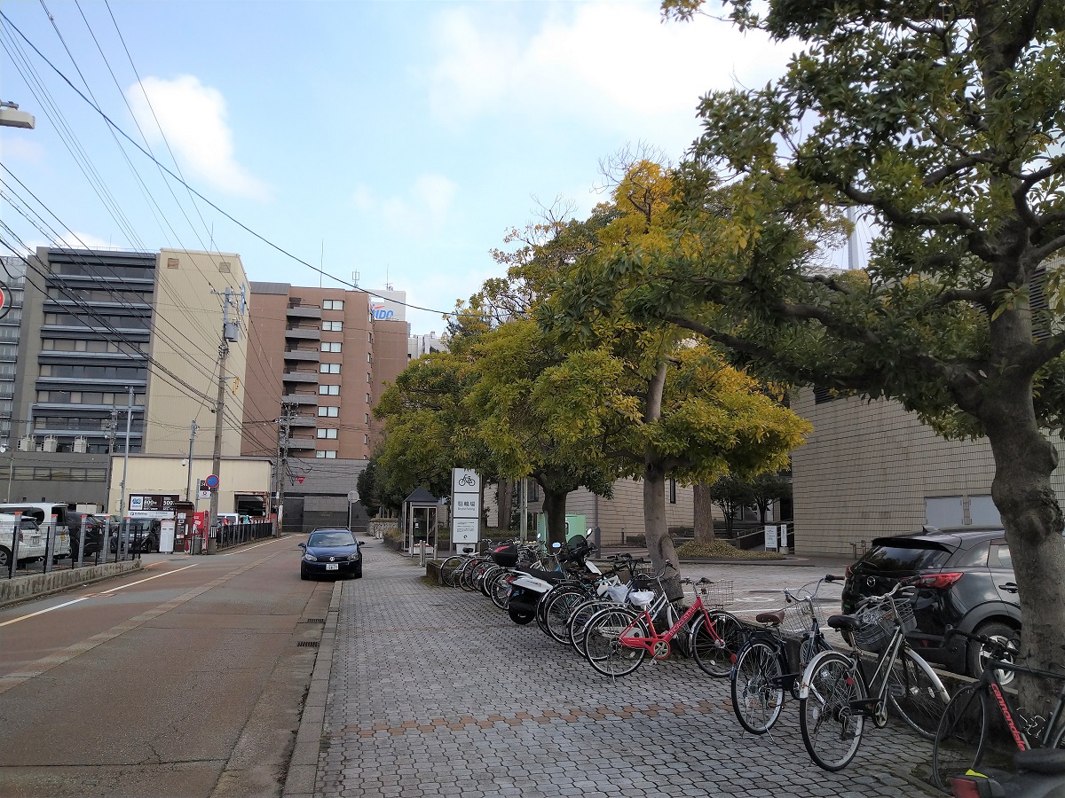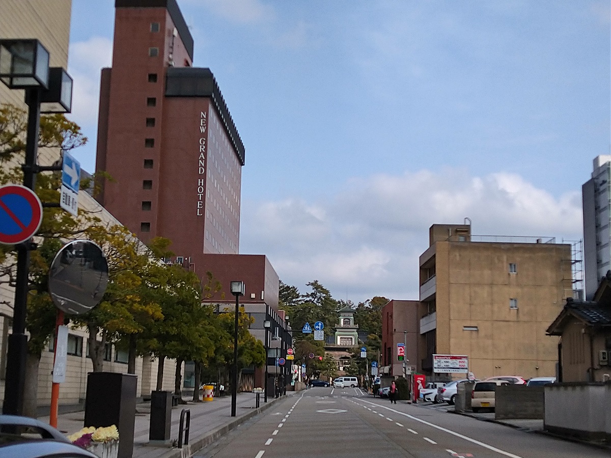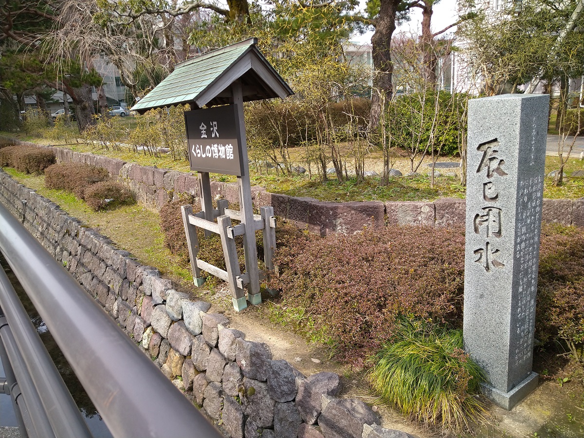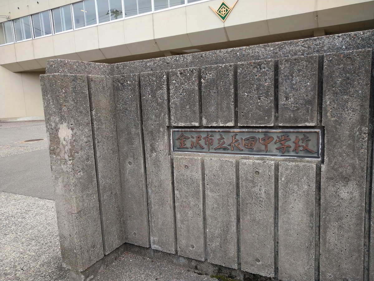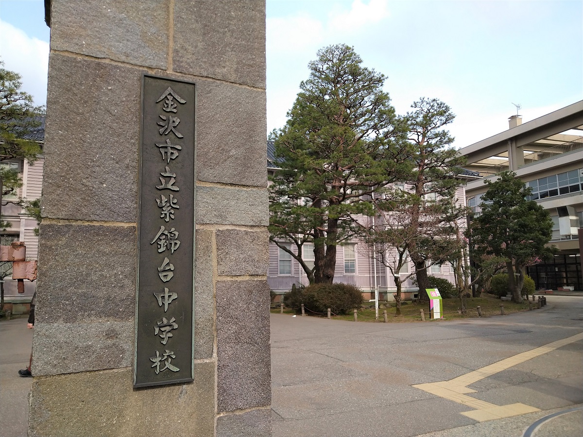 移転した高中の跡地は金沢市文化ホールになっている。玉川町商店街から通ったGさんは「痕跡は何もない」と言っていたのだが、記念碑(高岡町中学校跡地碑)があった。建物の脇の木々の裏にポツンと立っていた。鞍月用水に沿って歩いて、小さな橋(尾山橋というらしい)を渡り、ゆるい坂を上ると、正面に尾山神社が見えてくる。このあたりは今では立派な観光ルートだ。きれいな散策路になっている。